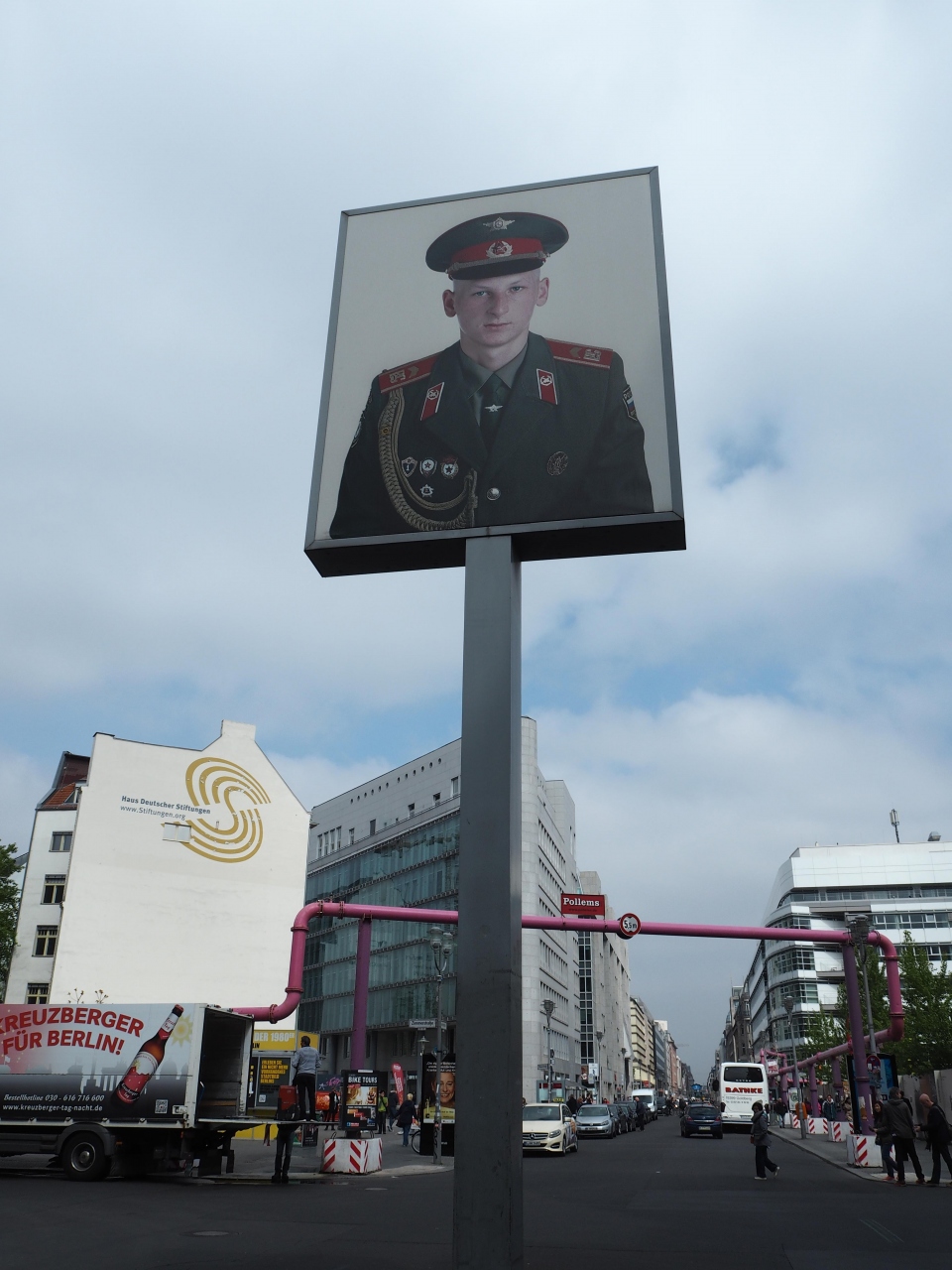 ベルリンが分断されていた時代、東西ベルリンを行き来するための検問所だった場所です。現在は観光用に当時の検問官の恰好をしたお兄さんがいて一緒に記念撮影をすることができます。記念撮影は有料で1人3ユーロ(2人で撮影する場合は6ユーロ)でした。