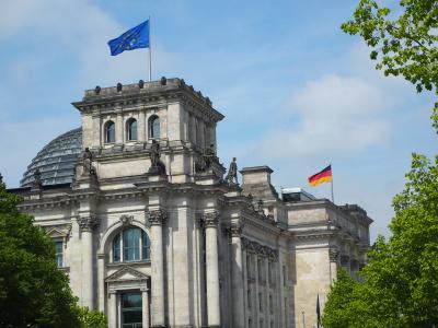 ツアーで内部の見学も可能なようですが、時間がなかったので外観のみの見学でした。EUの国旗とドイツの国旗がはためいていて立派な建物でした。議事堂の横の道路を100番のバスが通っており、議事堂近くにもバス停があるので、バスでのアクセスがおすすめです。