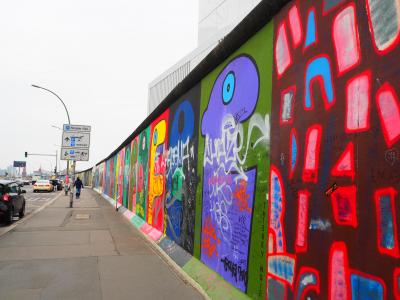 ベルリンの壁の一部に世界中のアーティストが壁画を施し、保管されているエリアです。日本の壁画はちょうど2つの駅の中間あたり、有名な2人の紳士の熱烈なキスの壁画はオスト駅ではないほうの駅に近い場所にありました。イーストサイドギャラリーの壁画は一部をのぞいて落書き防止のためのフェンスで囲われていました。