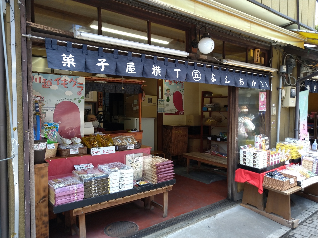 菓子屋横丁にある和菓子屋さんです。川越の中でも観光の一番メインの通りである蔵造りの町並みの通りでも同じ系列のお店を見かけました。こちらのお店でも「いも恋」という看板商品を店頭で食べ歩き用に販売していました。