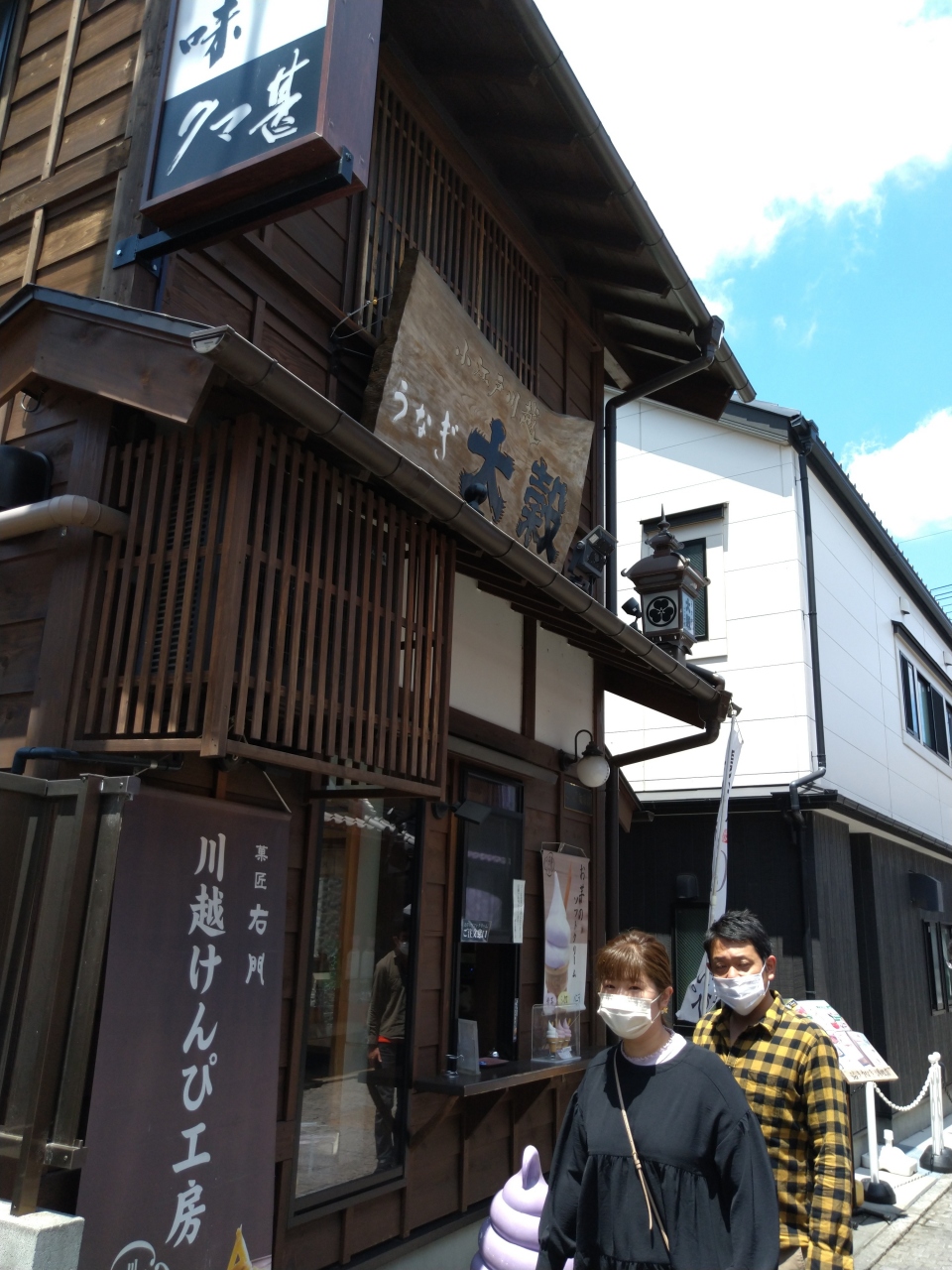 菓子屋横丁に入る入り口あたりにあったお店です。お店のまわりに池があったり、お店の横に大きなかえるのオブジェがあったりして、ちょっと目を引く外観の建物でした。こちらではただのうな重ではなく、川越の名物であるサツマイモが入ったうな重が有名のようでした。