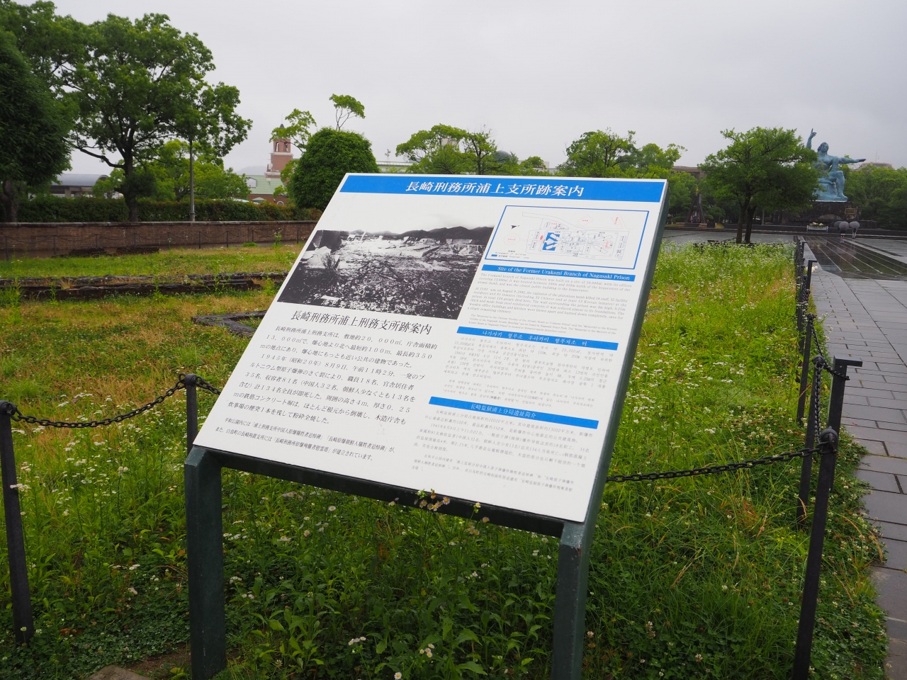 長崎の平和公園の敷地内に長崎刑務所浦上刑務支所跡であることを説明する看板と遺構が残されていました。原爆投下前はこの平和公園の敷地の一部は刑務所だったそうで、爆心地に近かったため原爆で倒壊し、現在はその跡だけが残されていました。