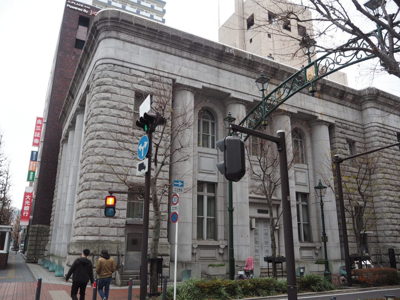 本町通りと馬車道が交差する本町四丁目交差点にたたずむ歴史的外観の建築物です。もともとは安田銀行の建物として建設されたもので、財閥解体のあと富士銀行に名前を変え、その後現在は銀行ではなく東京藝術大学大学院の建物になっているそうです。