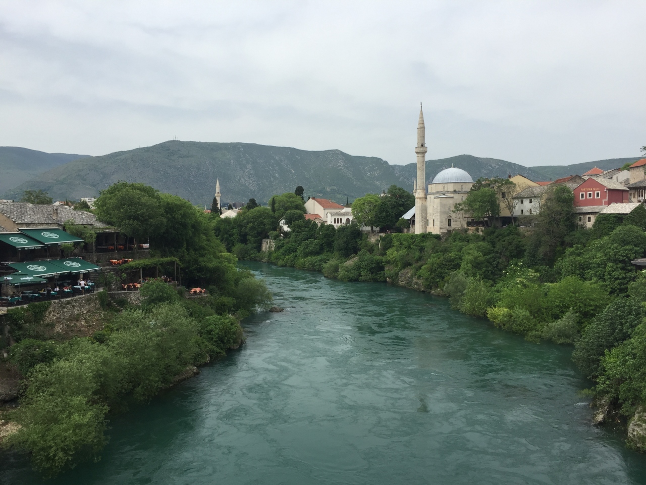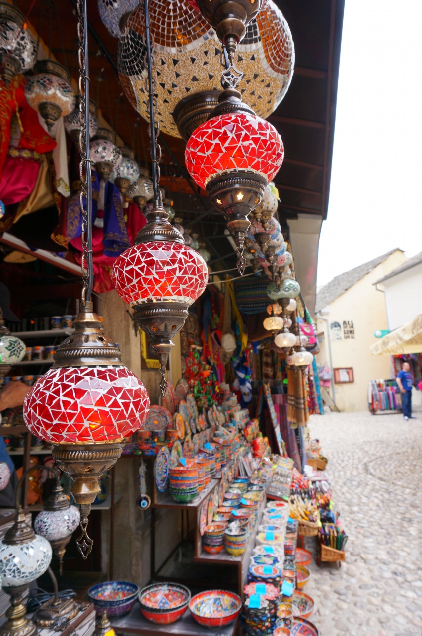 モスタルの街中を流れるネレトヴァ川にかかっているスターリモスト橋を中心としたエリアです。このあたりはお土産屋さんなどが多くて、観光客の姿も多く活気がありました。徒歩でのんびり街歩きが楽しめるコンパクトさでした。