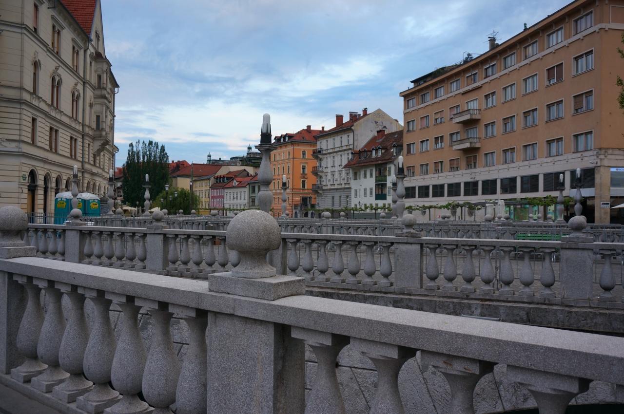 リュブリャナの市街地の中心部を流れるリュブリャニツァ川にかかっている橋のひとつです。リュブリャナの有名な観光スポットのひとつになっていました。名前のとおり中央に広めの橋、その両側に歩行者用の橋の3本がかかっていました。