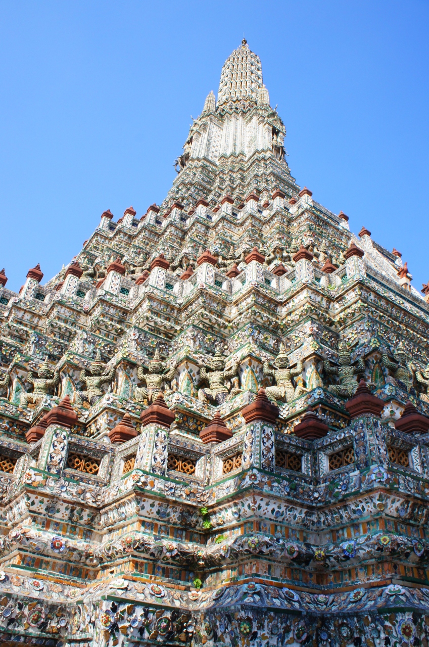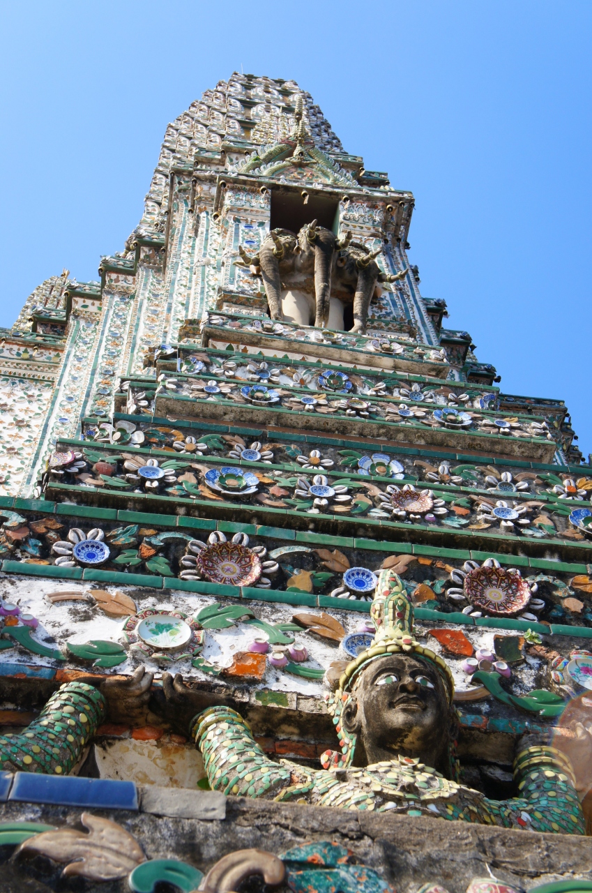 バンコクにある有名な三大寺院のひとつであるワット・アルンでは、5つの仏塔が有名ですが、その仏塔の上のほうにインドラ神が彫刻されています。3つの頭をもつ象の上に乗っていました。塔の階段の上のほうにありました。