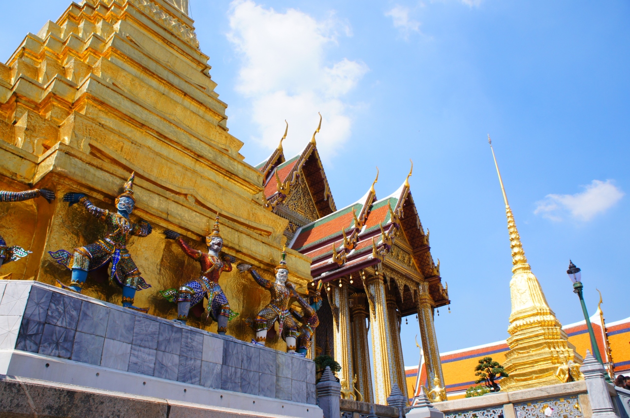バンコクにある有名な三大寺院のひとつであるワット・プラケオの敷地内にあります。プラサート プラ テーピドーンの両側にたっている仏塔で、金色で輝いていてきらびやかでした。台座にはヤック像が彫刻されていて台座を支えていました。