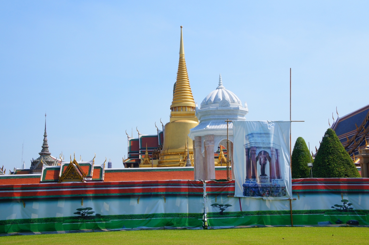 バンコクにある有名な三大寺院のひとつであるワット・プラケオ&王宮の入り口となっている門です。ワット・プラケオ&王宮はその敷地のまわりを真っ白い壁で囲われていて、こちらの門が出入り口になっていました。ワットポーから歩くと門までかなり距離がありました。