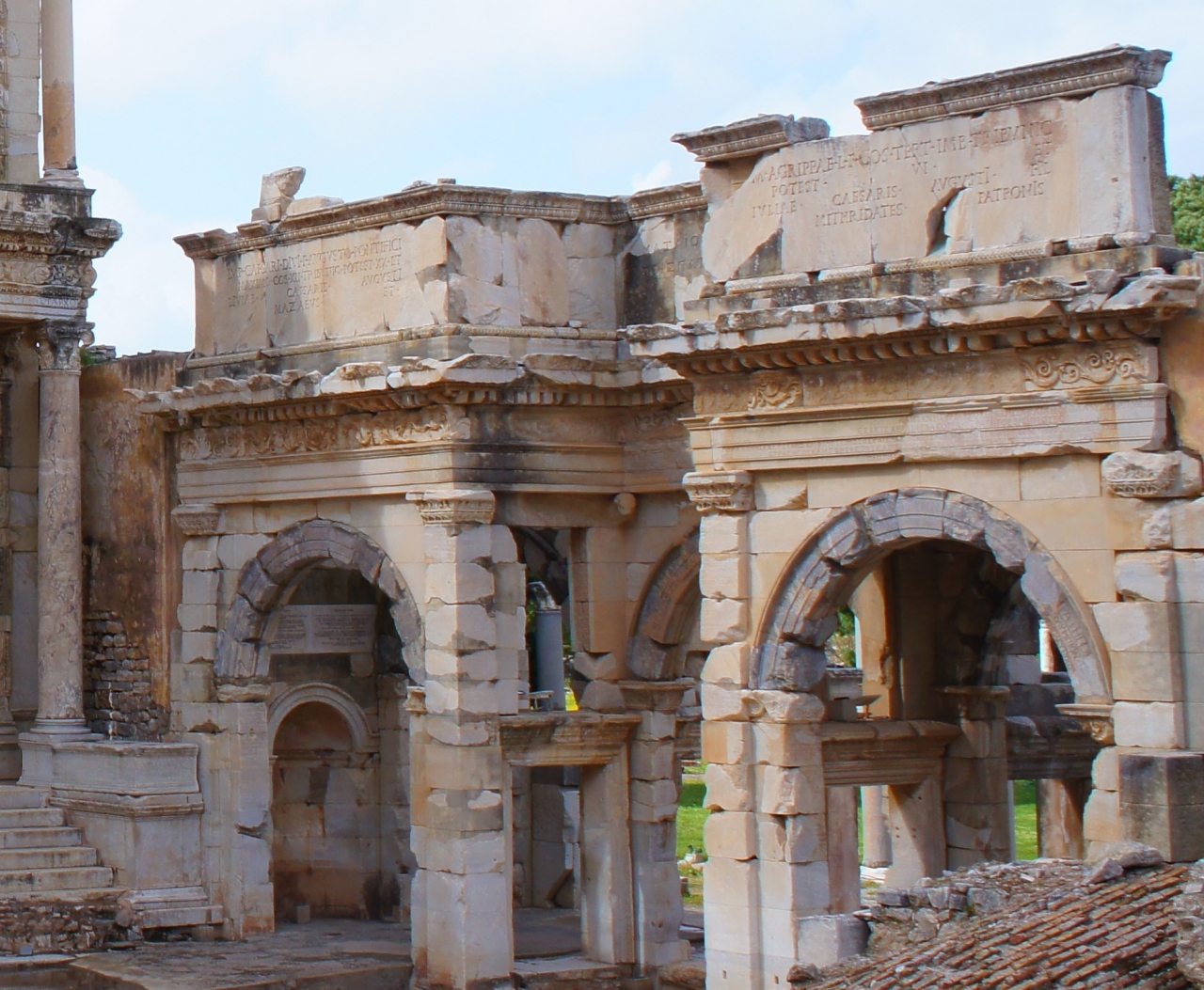 トルコにある古代ローマ帝国の都市遺跡であるエフェソス遺跡内にある遺跡の一つです。この門はエフェソス遺跡の中でも大きな遺跡であるケルスス図書館の隣にあって、このあたりの風景の写真はエフェソス遺跡を紹介する写真等でもよく目にする風景でした。