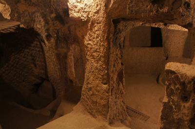 カッパドキアにある昔の地下都市の遺跡です。地下に入っていくと、通路だったり部屋だったりに分かれていて結構広かったです。細い通路を通ったりして足場が悪いところもあるので歩きやすい靴のほうが良いと思います。