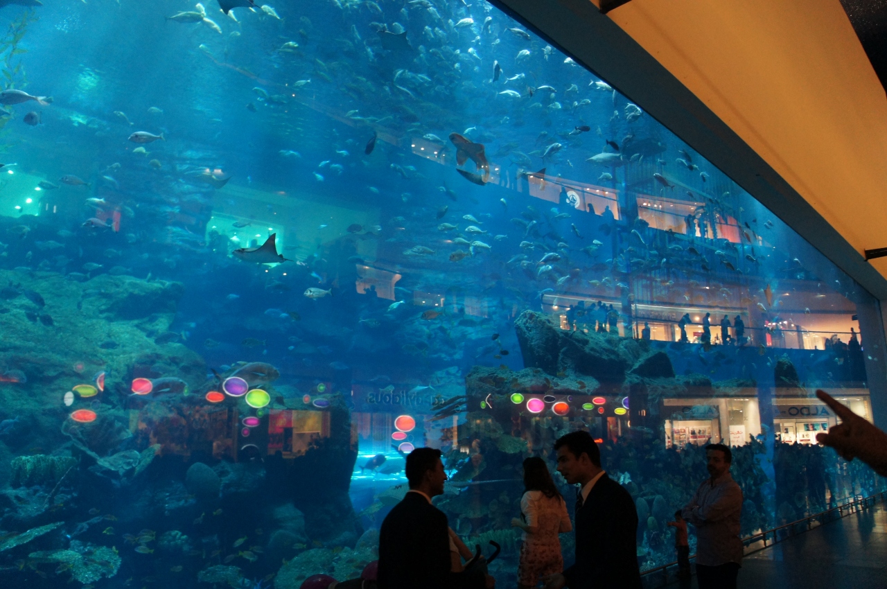 ドバイモールの中に入っている水族館です。無料のエリアと有料のエリアがあり、今回は無料のエリアにある巨大な水槽のみ訪れました。ドバイモールの中に現れる巨大な水槽で、世界一の大きさだそうです。吹き抜けのつくりになっているのでいろいろな階から眺めることができました。