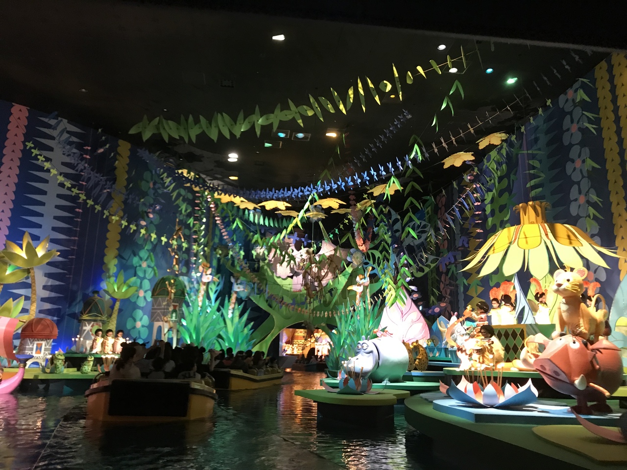 長らく工事中でしたが、新たにリニューアルオープンしていました。現在はファストパス対象のアトラクションとなっていて、プーさんのハニーハントと同じ場所にファストパスの発券機が設置されていました。かわいいお人形に囲まれたゆったりとした船旅でした。