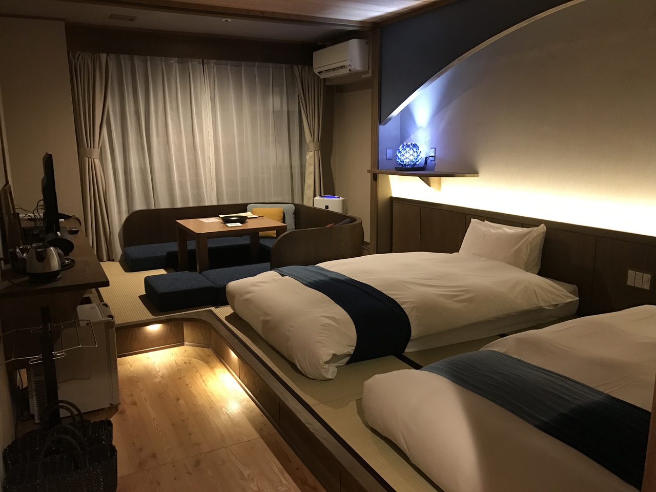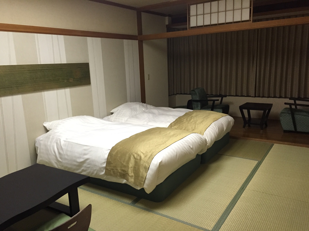 西伊豆の土肥温泉にある旅館です。女性のみ色浴衣が選べました。館内はエレベーターや浴場まですべて畳敷きでした。夕食も朝食も部屋食でどちらも食べきれないくらい豪華な料理で、海鮮がいろいろ食べられておいしかったです。あいにくの曇り空でしたが、窓の外はすぐ海なのでサンセットはとてもきれいなのだそうです。