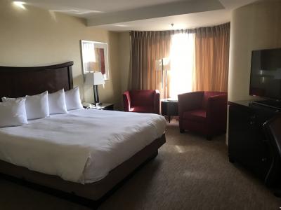 ヒルトン系列のホテルで、ヒルトンの会員になるとwifiが無料で利用できました。(通常ロビーのwifiは無料ですが、客室のwifiは有料でした。)メトロやケーブルカーなどのパウエル駅が近くにあるので交通の便が良かったです。部屋やバスルームもとても広々としていました。