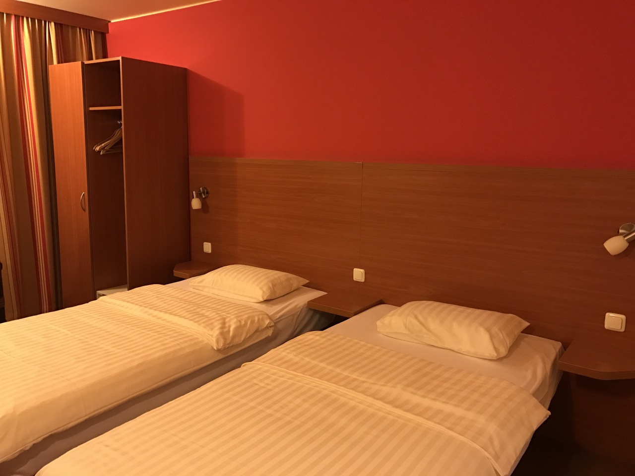 フランクフルト中央駅から徒歩5分くらいでした。23:00頃に駅に到着してホテルに向かったのであまり人通りはありませんでしたが、危険な雰囲気もありませんでした。ツインのお部屋でしたが、2人でスーツケースが十分広げられる広さで部屋も清潔でした。シャワーのお湯も十分でていました。
