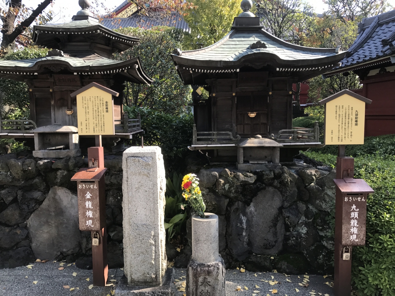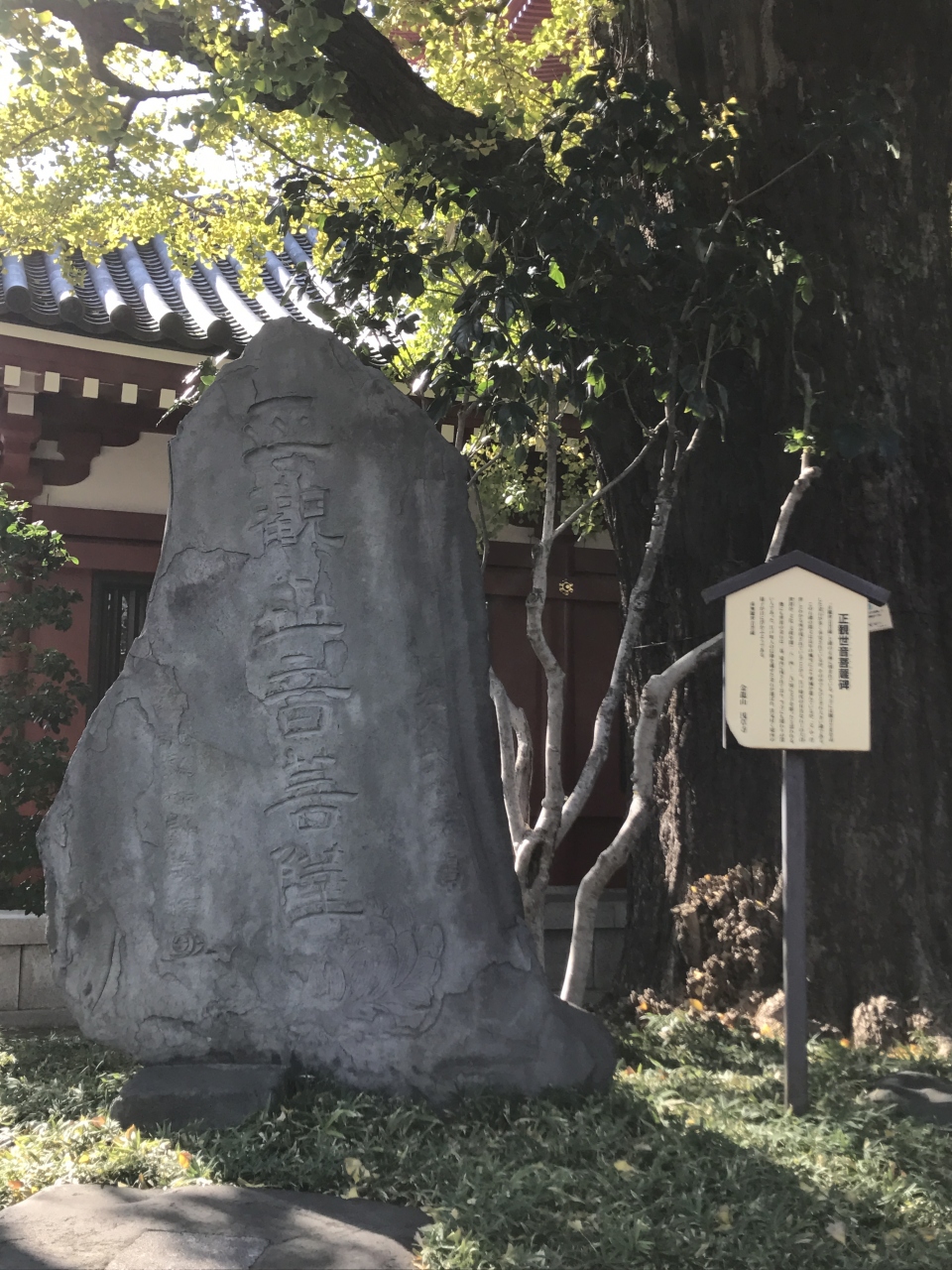 浅草寺の本堂から東側のエリア、東門の二天門から入るとすぐの場所にある浅草神社の境内にある記念碑です。それほど目立った感じではなく、神社敷地内の端のほうの木々が植えられている植え込みの中にありました。江戸時代から明治時代にかけて活躍した歌舞伎の作者の碑なのだそうです。