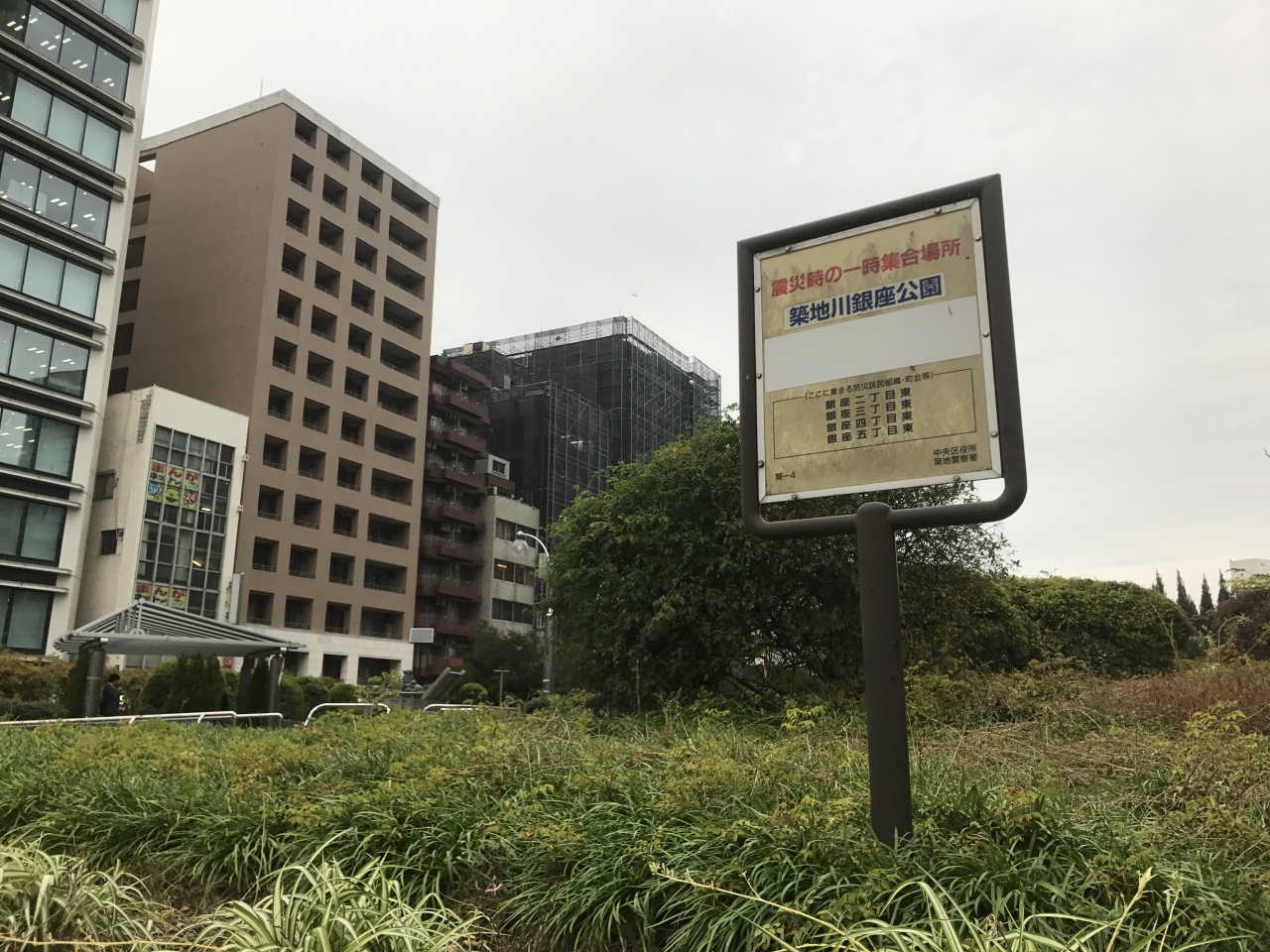 新富町駅近くにある公園です。公園といっても首都高をまたぐように新富橋があってそのたもとにあるちょっとした広場です。平日のお昼時だったので、近隣の会社で働いているサラリーマンが多くたむろして煙草を吸っていました。