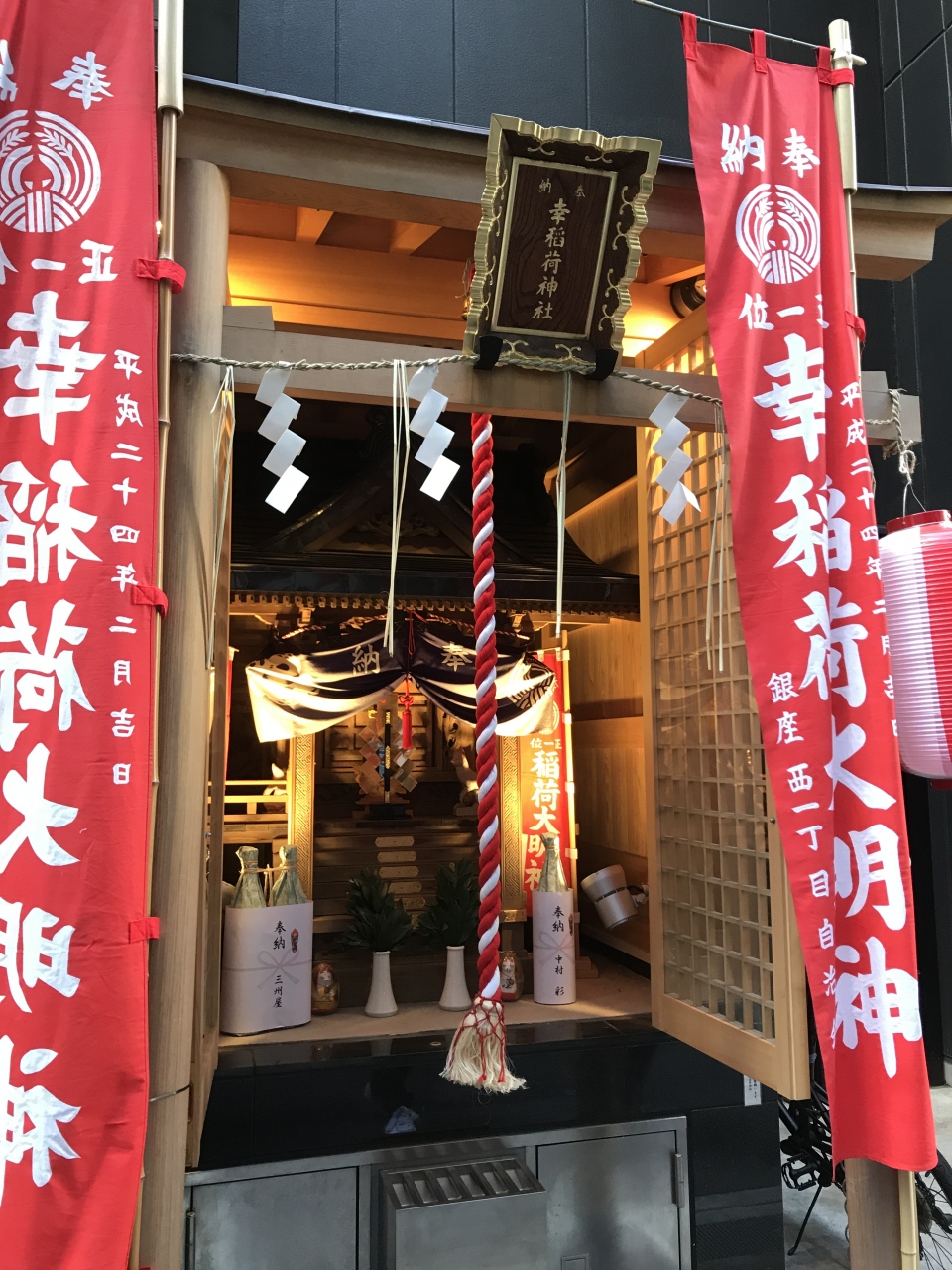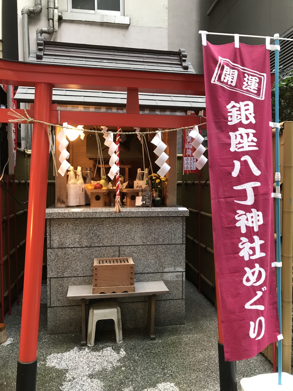 銀座八丁神社めぐりの対象神社になっていたので訪れました。建物と建物の間の細い通りを入った先に小さな神社がありました。銀座八丁神社めぐりの時間帯だったので神社の名前が入った赤い旗が立てられていて人も集まっていたのでわかりやすかったです。