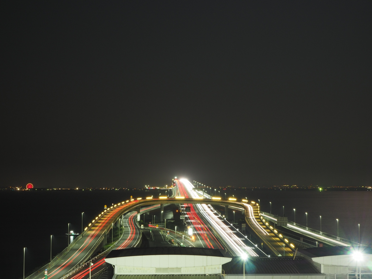 海ほたるパーキングエリアに夜に立ち寄った際に、建物の屋根の部分が紫色っぽくライトアップされていました。夜ですと海自体は真っ暗で楽しめませんが、建物のライトアップや反対側の高速道路の車の光はきれいでした。川崎方面や木更津方面の街の明かりも見えますが、かなり遠いので夜景を楽しめるというほどではありませんでした。