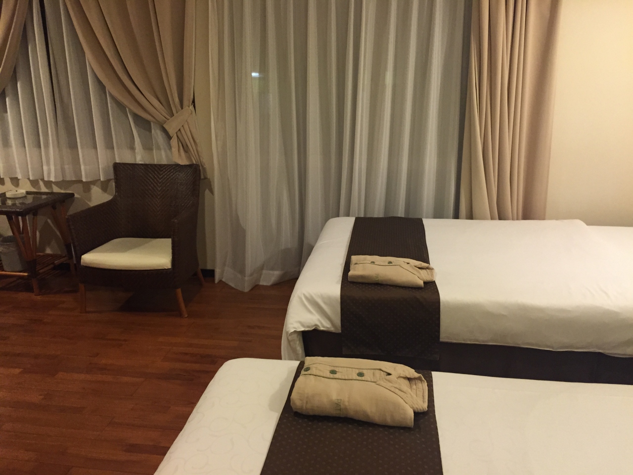 ホテルのロビーからリゾート感あふれるホテルでした。ホテル前の駐車場が満車だったため少し離れた駐車場を案内されました。各部屋にもバスルームがありますが、大浴場もあって、岩盤浴も無料で利用できました。ただ、岩盤浴は22時まででした。