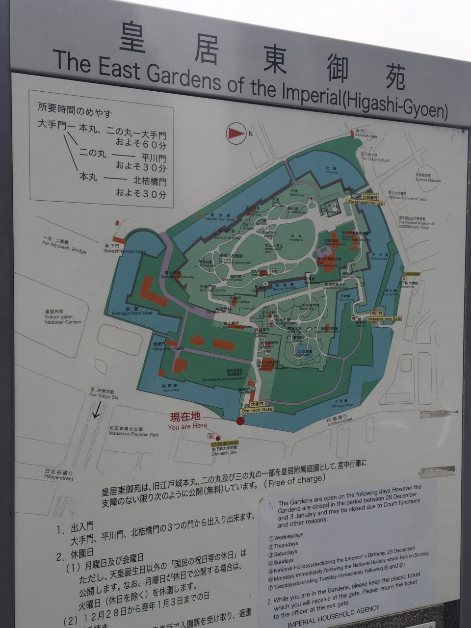 皇居東御苑は無料で見学できるようになっていますが、入り口のところで受付が必要になっていました。昔は江戸城のあった本丸跡地などを見学できるようになっていて、本丸跡地付近は現在は芝生に広がる広場になっていました。