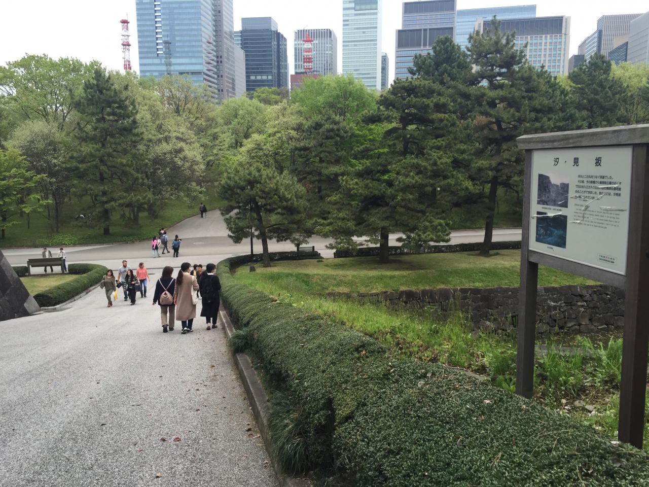 皇居東御苑の敷地内にある坂です。二の丸と本丸をつないでいる坂道となっていて、結構急な坂でした。ただ、その分坂を登ると周辺やその向こうの都心の高層ビル群などが見えて景色はよかったです。昔はここから海が見えたそうです。