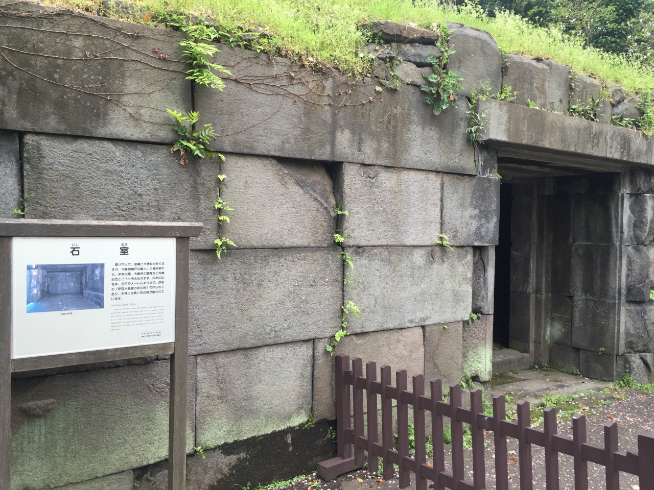皇居東御苑の敷地内にありました。江戸城天守閣跡などを見て、本丸のエリアをぐるっと散策している際に見かけました。名前の通り石で作られた蔵になっていて、当時は火災などの際に重要な物をここに保管する目的で使われていたようです。