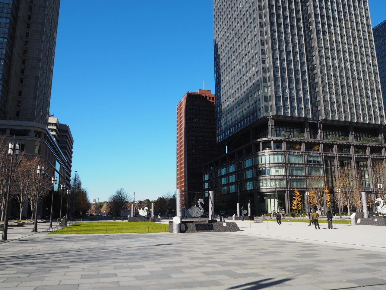 東京駅の丸の内側に広がる広場です。ながらく工事が行われていましたが、一部芝生になっているとても広々とした美しい広場になっていました。ちょうどクリスマス前の時期に訪れたので、イルミネーションも設置されていました。