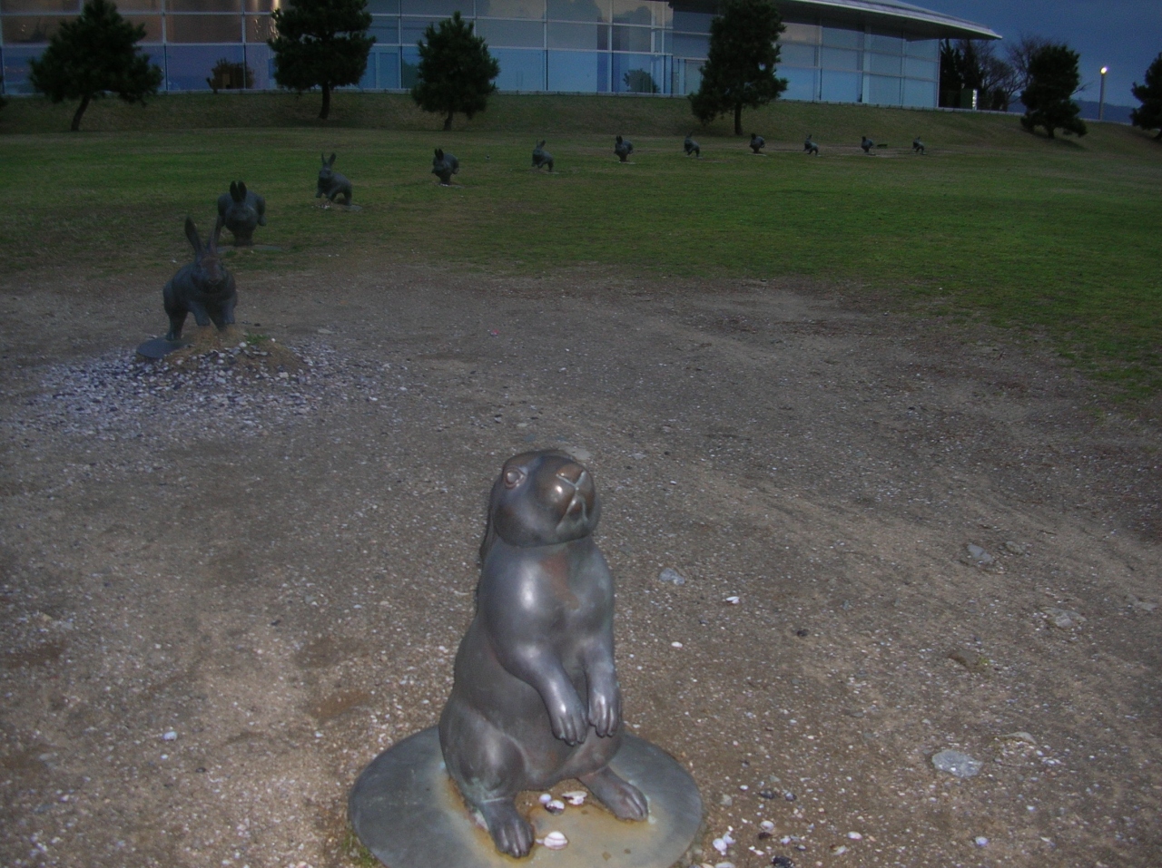 宍道湖のほとりにある美術館です。展示室に入るのは有料ですが、建物内に入ったり、宍道湖うさぎがいる前庭の部分には自由に入れました。あいにくの曇り空できれいな夕日は見えませんでしたが、こちらの建物からきれいに夕日が見えるそうです。