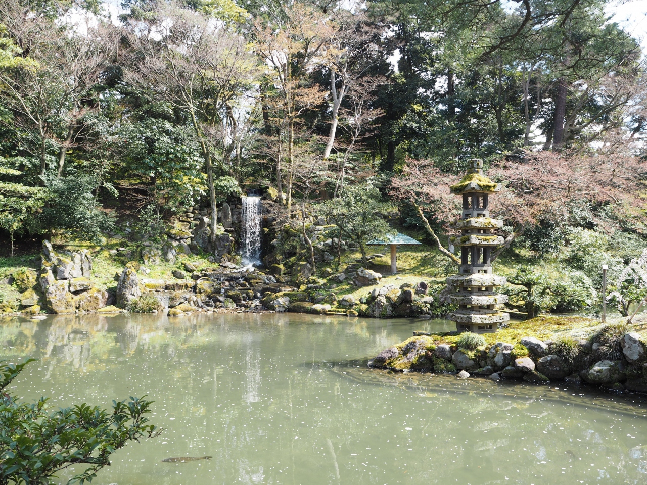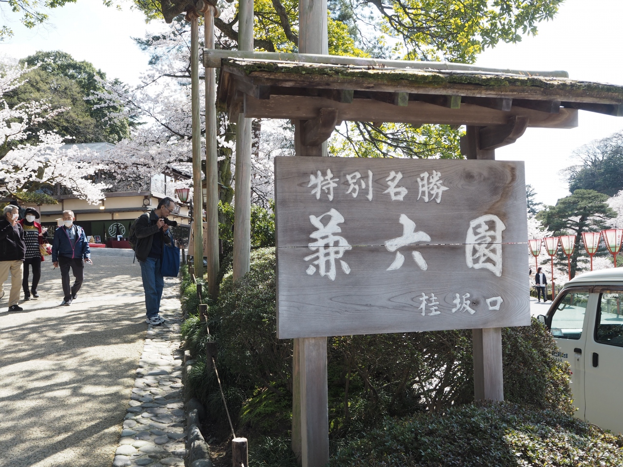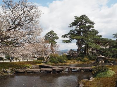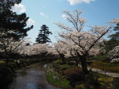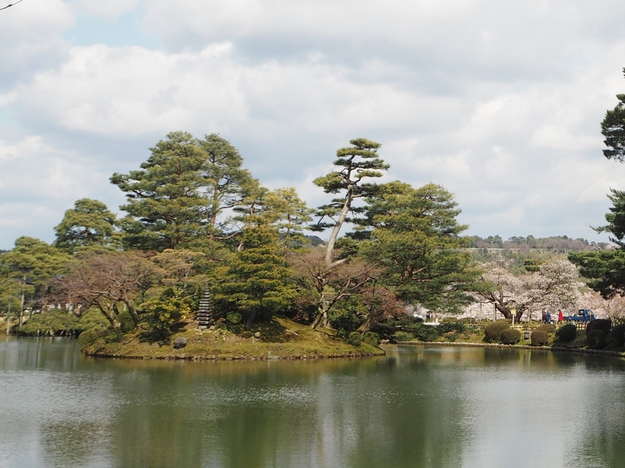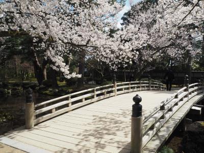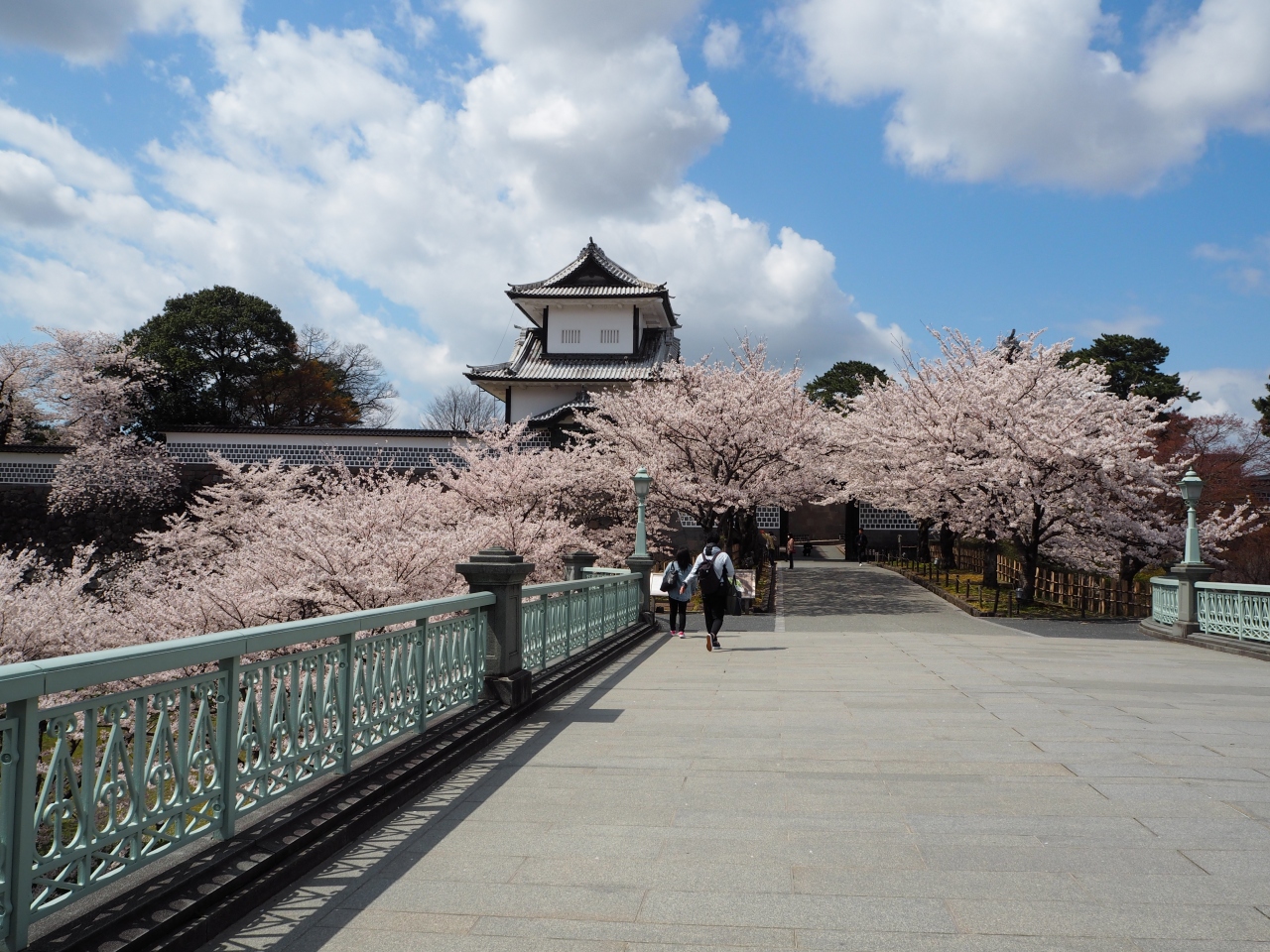 兼六園の入り口と隣り合っているメインの入り口である石川門につながっている橋です。この橋は金沢城まえの大通りの上に設置されていました。4月の上旬に訪れましたが、ちょうど桜が見ごろの時期で、ピンク色でとてもきれいでした。