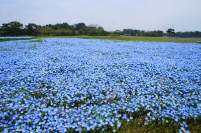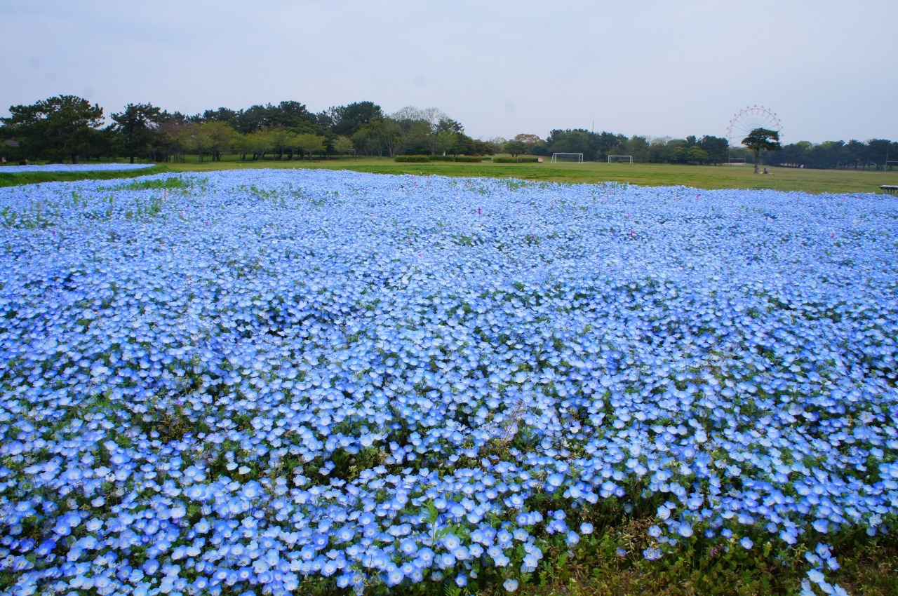 とても広い公園の中にある芝生のエリアです。春で気候の良い日に訪れたので、芝生ではレジャーシートをひいてピクニックしている人を多く見かけました。また、ネモフィラが開花している場所もあって青色の景色が広がっていました。