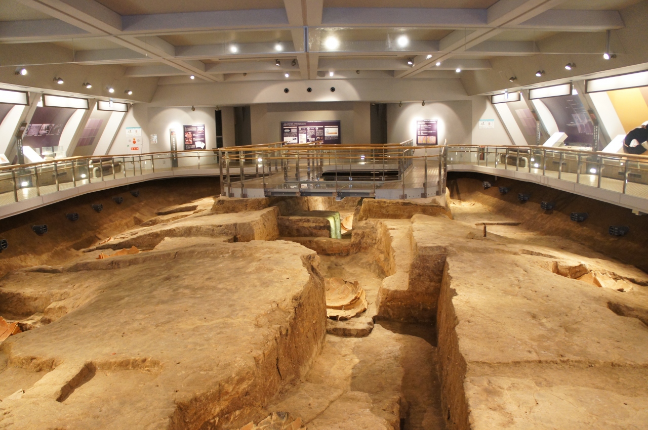 吉野ヶ里遺跡を少し奥のほうに進んでいった場所にありました。こちらは歴代の王が埋葬された特別なお墓なのだそうです。お墓の内部を発掘した状態が見られるような施設になっていて、いろいろな説明の展示などもありました。