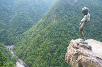 祖谷渓のつきだした岩で、岩の上には小便小僧の銅像があります。柵が設けられているので、岩の上の小便小僧に近づくことはできません。かなりの高所なのでのぞきこんでみると結構スリルがあります。通りかかる人はみんな車をとめて記念撮影していました。
