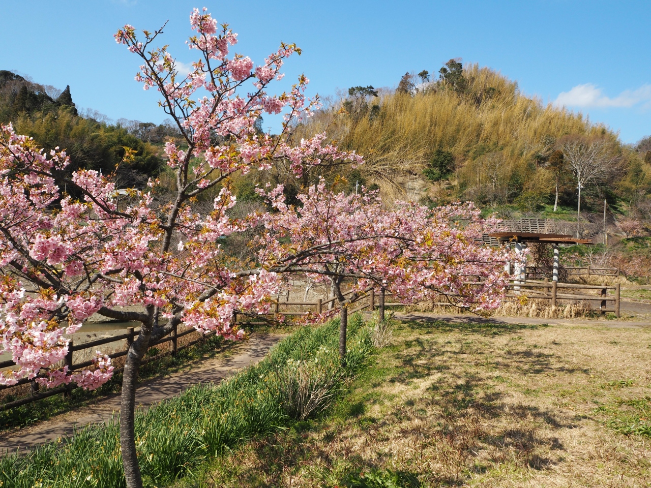 2月に訪れましたが、公園内に植えられている早咲きの桜である頼朝桜がきれいに咲いていました。ここは水仙も有名なようですが、もうだいぶ枯れかけてしまっていました。お花見できている人が多く、駐車場も混雑していました。