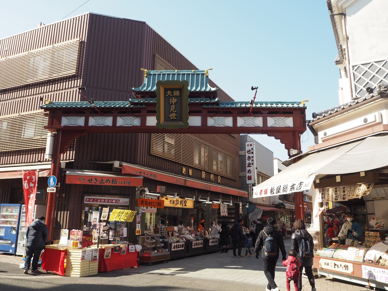 川崎大師の大山門前に広がる仲見世通りにお店がありました。仲見世通りの入り口付近にあって、さまざまな種類の飴が売られていました。店頭でとんとんと音をたてながら飴がカットされていって、試食などの声掛けもあって活気がありました。