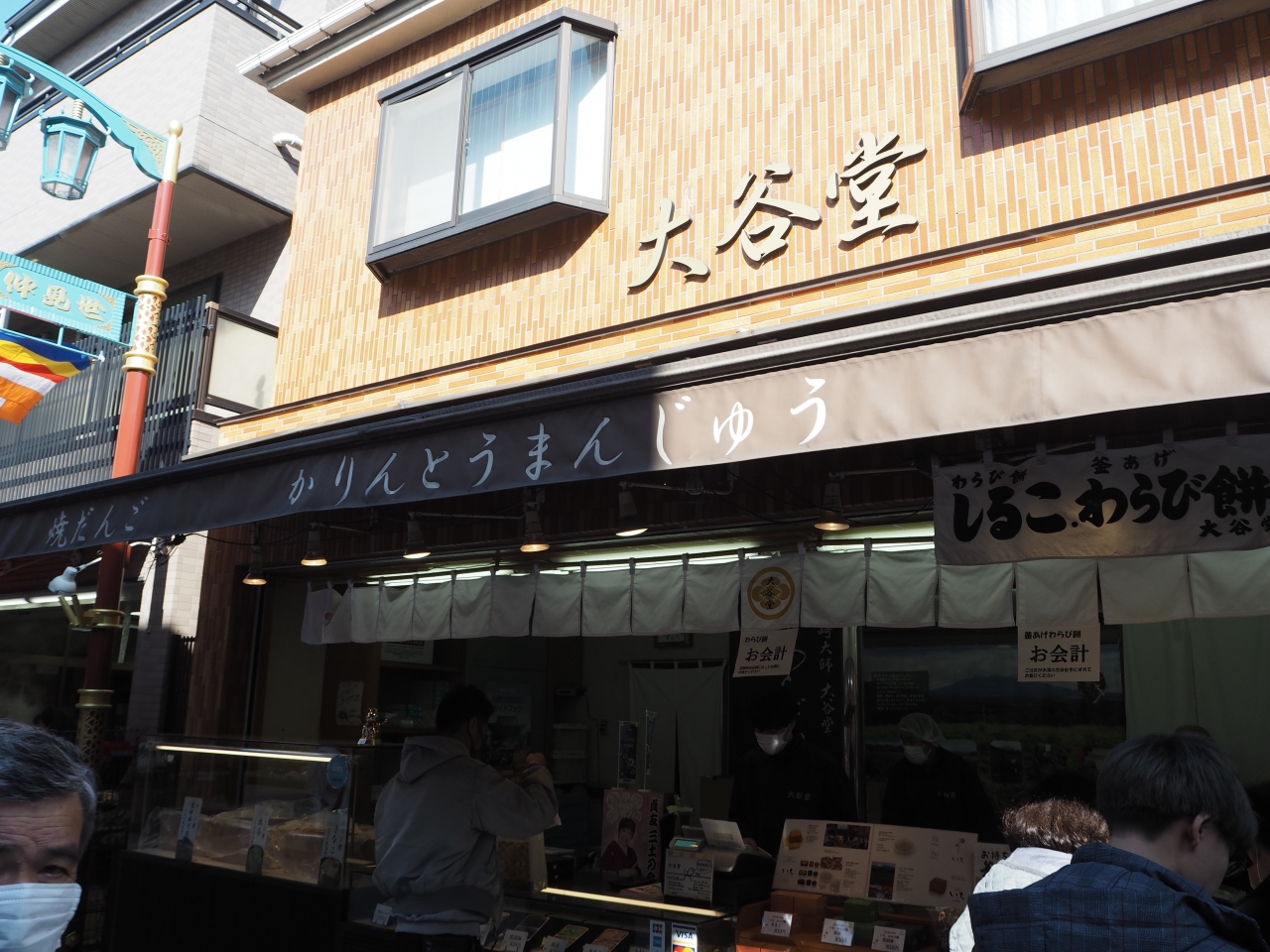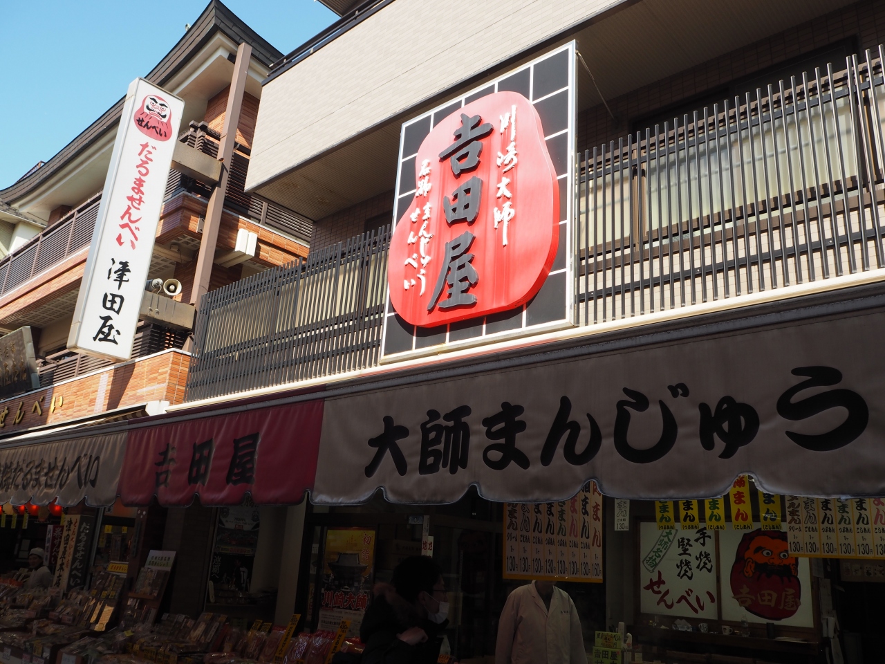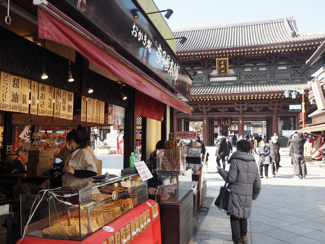 川崎大師の大山門前に広がる仲見世通りにお店がありました。大山門の手前あたりでした。こちらはおせんべい屋さんのようで、さまざまな味のおせんべいが並んでいました。1枚で購入できるので、食べ歩きにもちょうどよい感じでした。