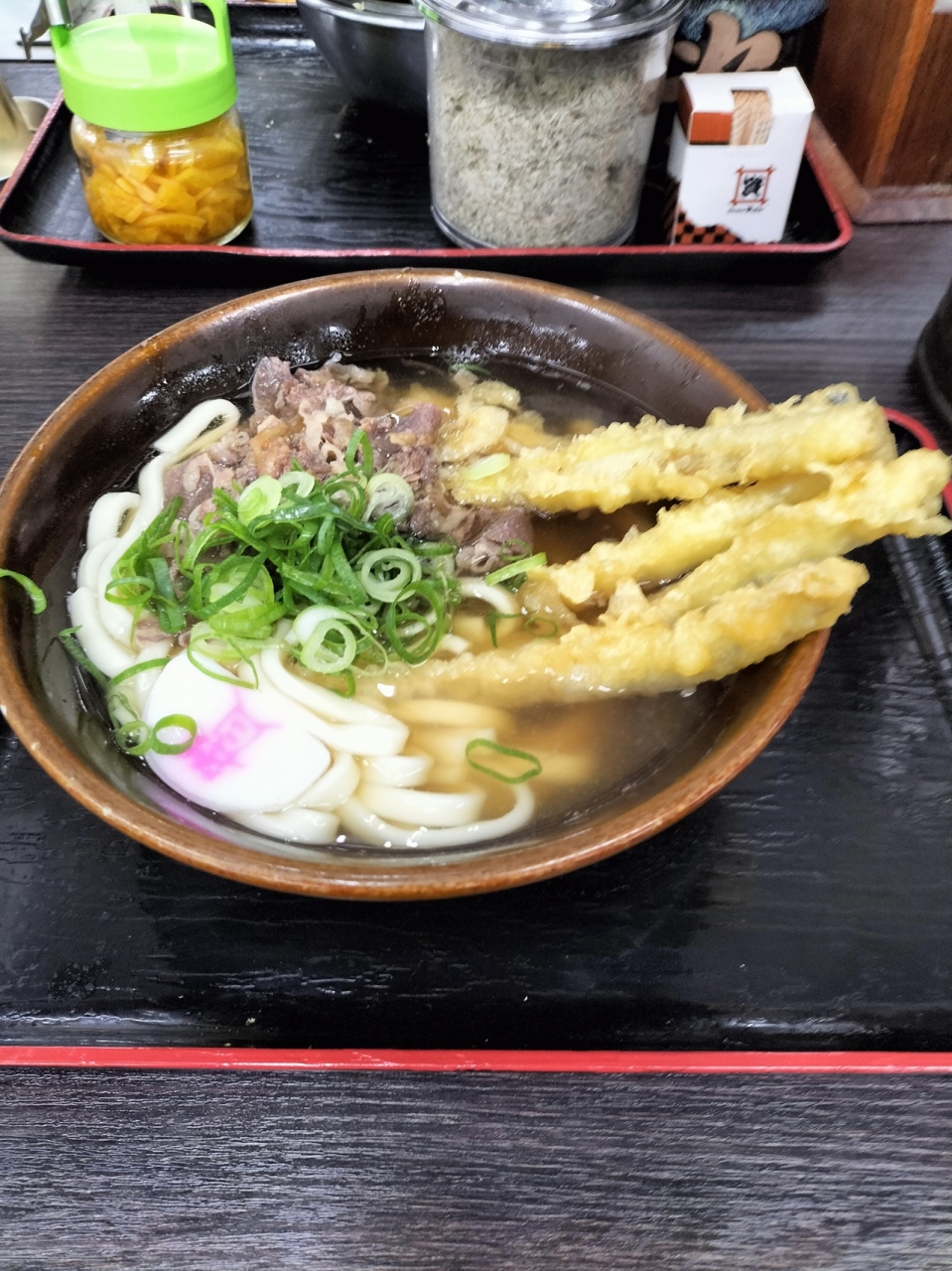 福岡と言えば博多ラーメン!でなくうどん!と聴いたので友達のお薦めで資さんへ行きました。小倉城から歩いて10分程度で着いたら、昼時で列が出来ていました。席に通されるとすかさずお薦めの肉ごぼう天を注文。トッピングも席に常設されており迷いました。お薦めの価値ありでした。満足。
