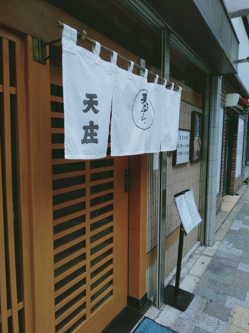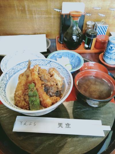 昔ながらの天丼を求めて明治42年創業の老舗へ。上野広小路駅から数分。大きな看板と暖簾があります。入るとカウンターとテーブル席1ヶ。二階に座敷あるようです。注文してから食材に包丁を入れて作ってくれます。出来立てを昔ながらのお味で。エリンギ、海老、ナス、キス、小柱と海老のかき揚げでした。味噌汁は赤味噌のシジミ汁です。