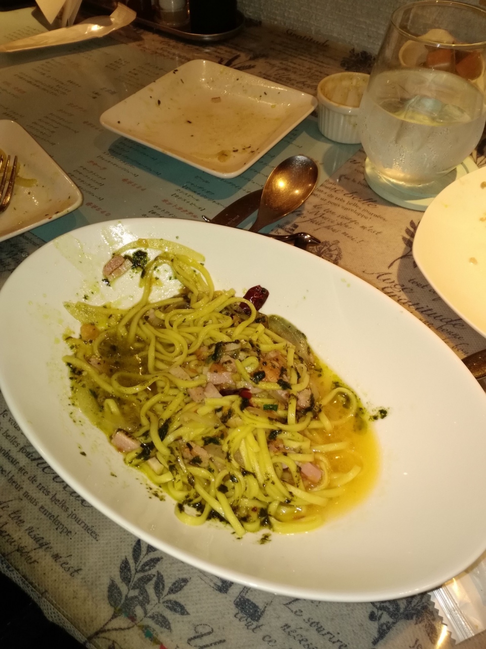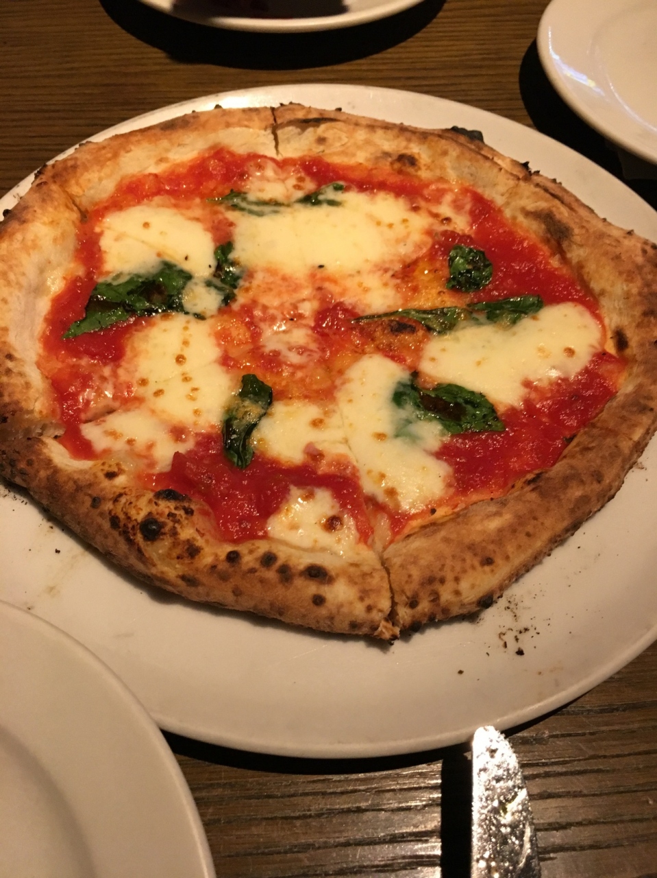 しばらくぶりに入店(3回目)。この日もほぼ満席でした。予約して友と2人で会食。「ちょい飲みセット」(1,250円)で乾杯。この前菜、ちょっとちょっとでもみな美味しい。ハウスワイン(赤ワイン)はとても気に入ってます。サラダ:サラダカプレーゼ。パスタは、ポルチーニ茸。ピッツァは、マルゲリータとアンチョビとオリーブ、ケッパーのハーフ&ハーフをオーダー。とても満足。パスタ、ピッツァ生地とも独特です。追加で赤ワイン飲んで帰りました。通勤帰りに覗きますが、テーブルは満席が多いです。席が少ないのでしかたないでしょうが、フラッと入るならひとりでカウンター(5名)ですね。