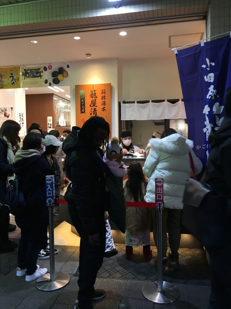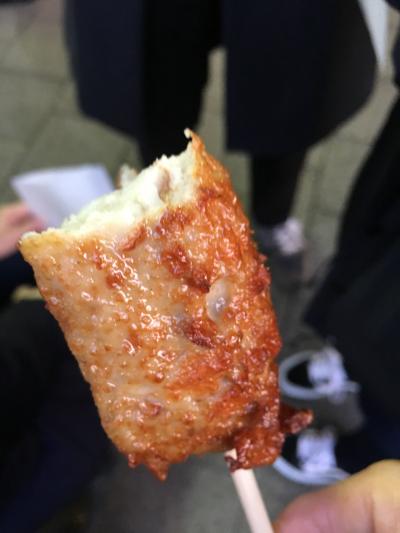 家族で日帰り温泉に行くついでに湯本駅前を散策。とてもイイ匂いのする方に誘われて列にならびました。約30人くらいでしょうか。オーダーして揚げるシステムでないので自分の番になった時に品切れもあります。カニとイワシにしました。写真はイワシ。カニは丸に近いかたち(ふわふわ)。アツアツでどちらも美味しかったです。その場で食べる観光客(外国人も多数)が多いので店前はいつも混雑してますよ。