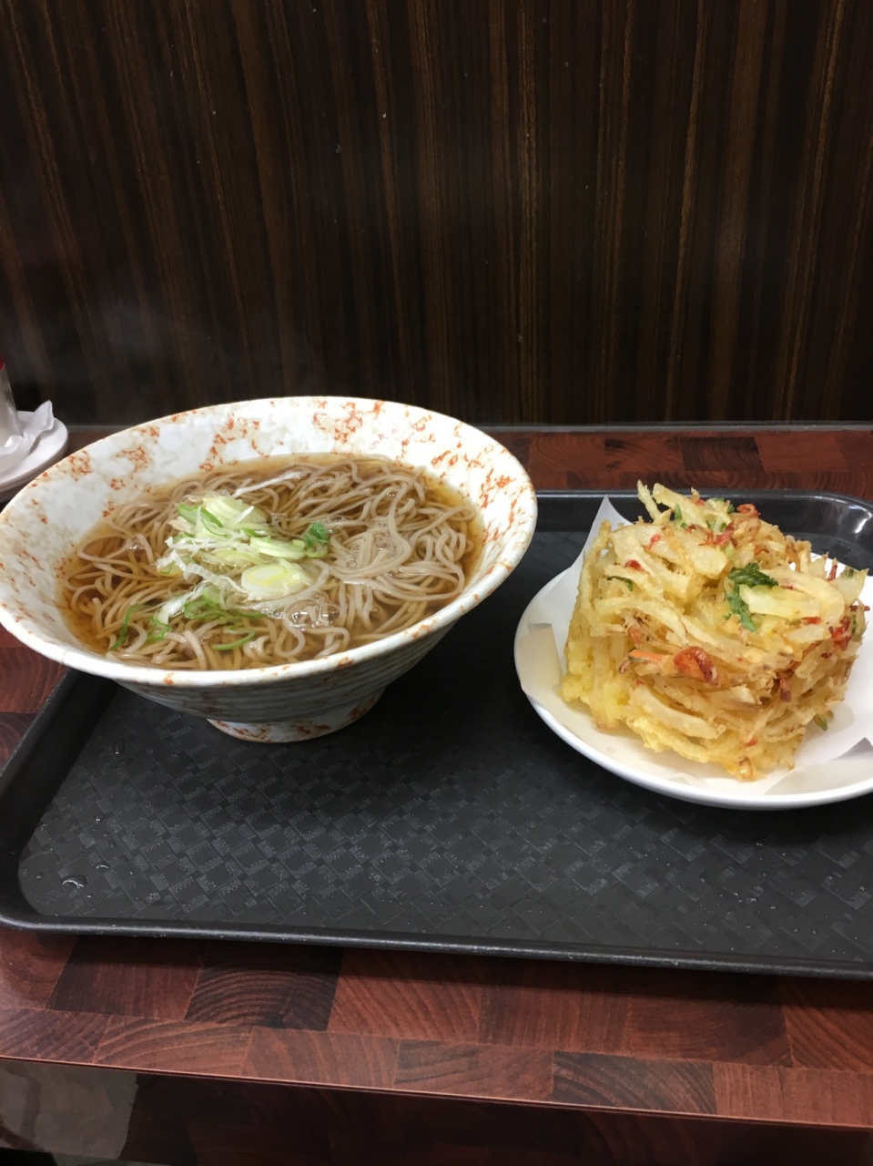 お友達の薦めで、行ってみました。まさかと思っていたんですが、カウンターで注文(天ぷらそば)して代金払ったら、おもむろに天ぷらを作り始めました。しかし、手際が良くて測ってないけど10分かかってないかな?出来上がって呼ばれた。これもやっぱりで別にしてある。どのように食べるか、お客に任せるオモテナシ!これで400円。安~い。立食い店ですが、カウンター席が多いので、座って食べました。