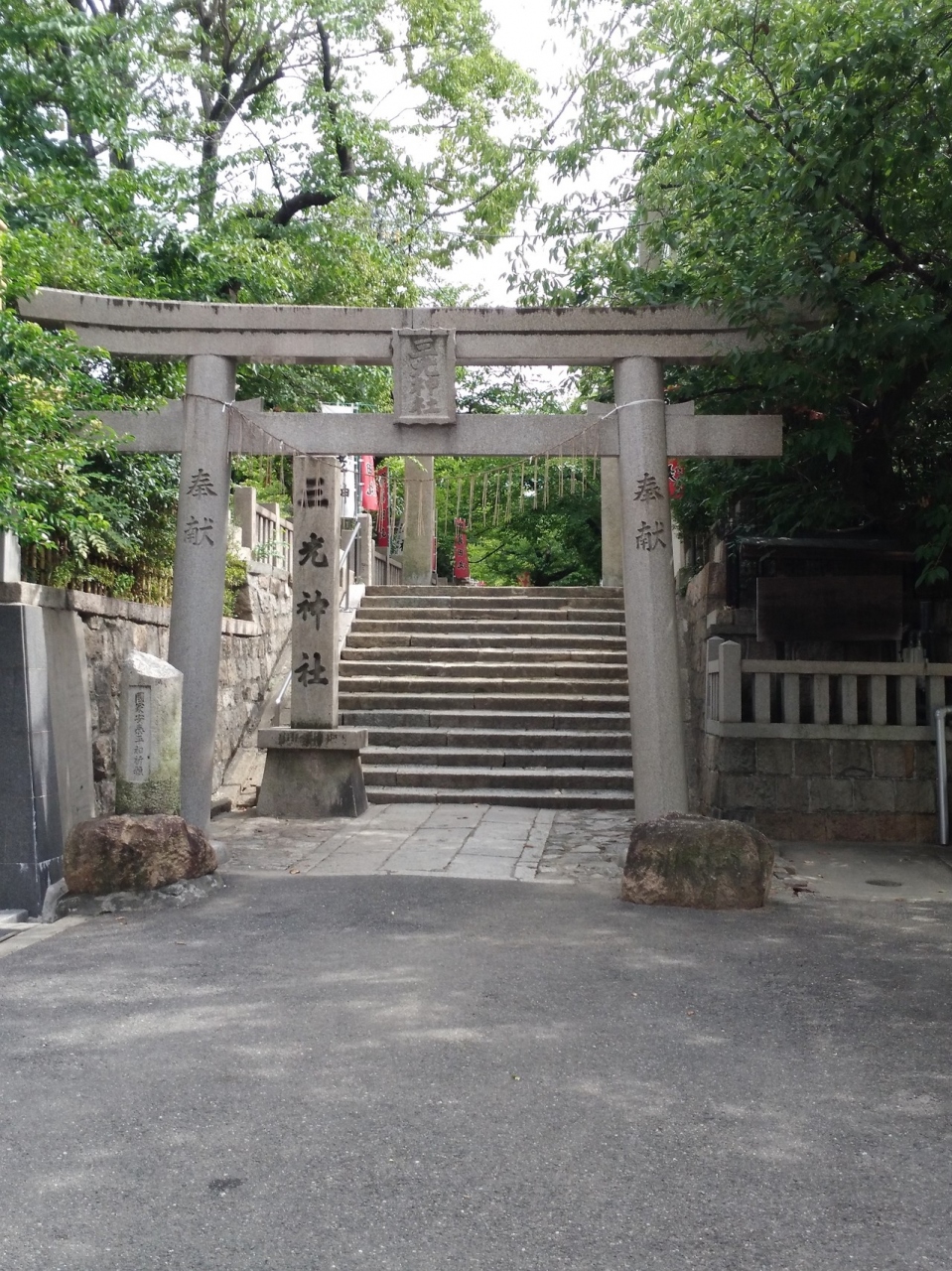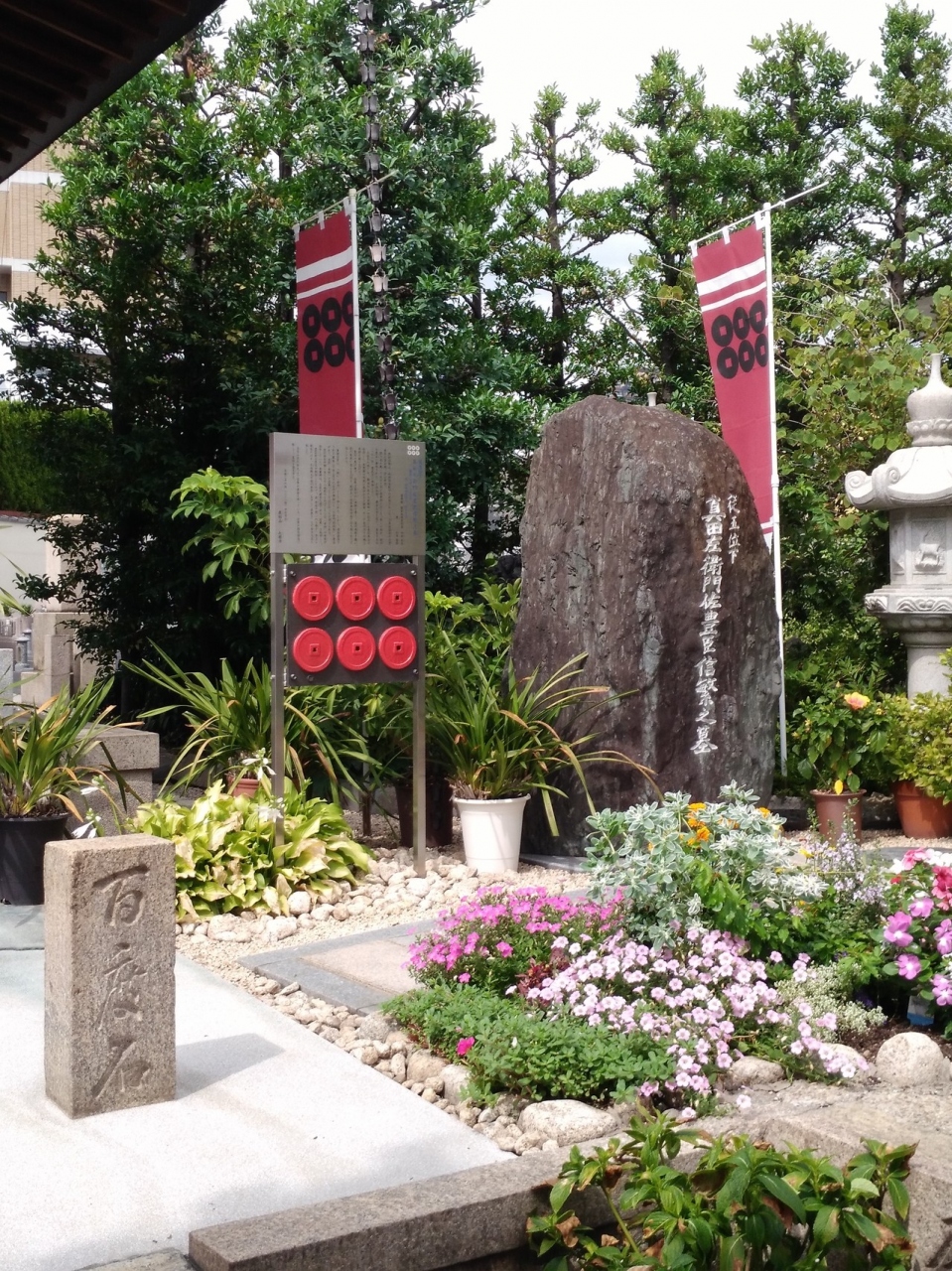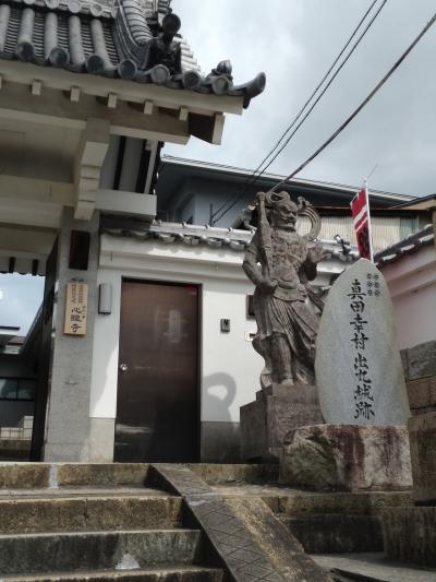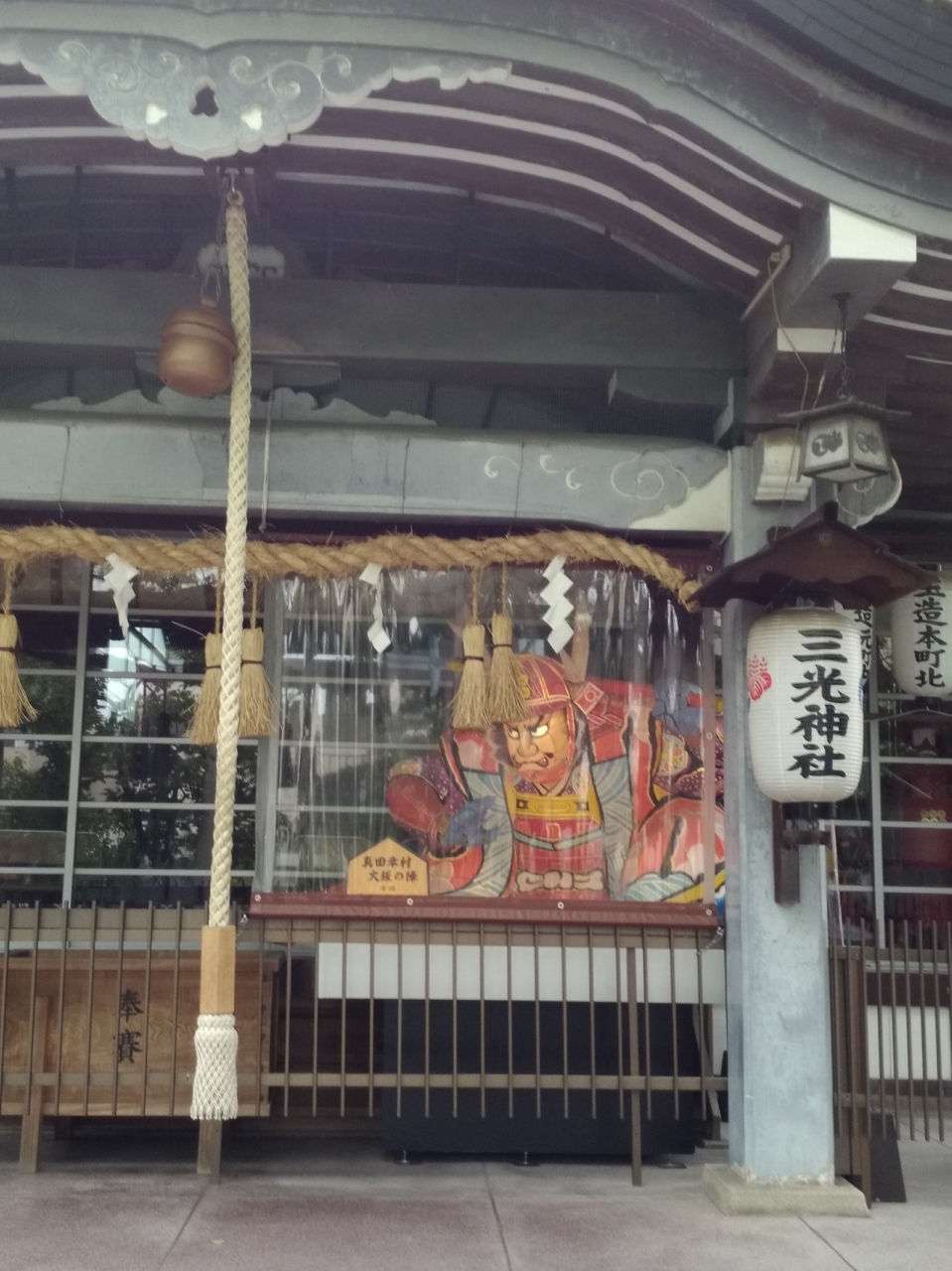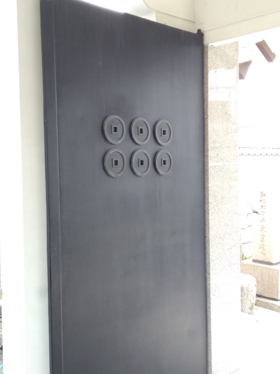 友達から安居神社だけでなくこちらもお薦めということで訪ずれました。玉造駅からほど近く、三光神社に行くついでに行けます。門扉に六文銭が描かれていて、赤ののぼりも