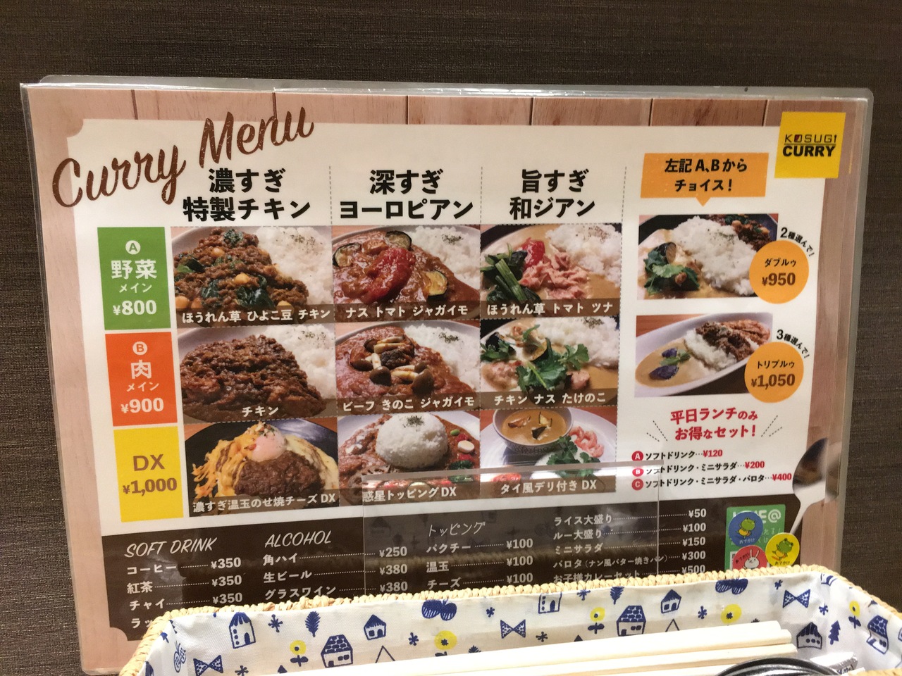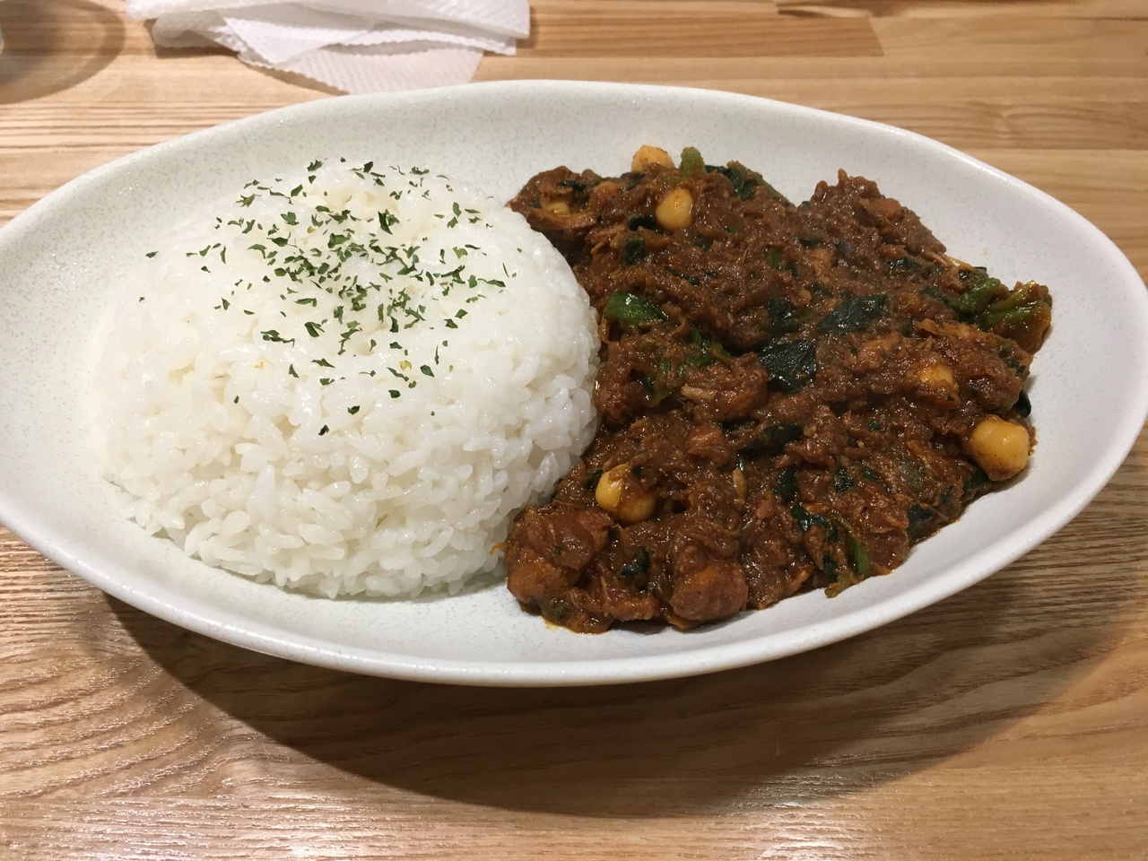 FBでよく見かけるので、行ってみました。メニューがコスギとのゴロ合わせ。「濃い」「旨い」「深い」の3種に分かれてました。はじめてなので、濃いの野菜系(チキン、ほうれん草、ひよこ豆)にしました。ルーが流れないので、ちょっと食べるの難しかったけど。ルーが少ないわけでもなく。香辛料がいっぱい入ってそうな味は、イイ感じ。次回は、旨い、深い、いずれがにチャレンジします。