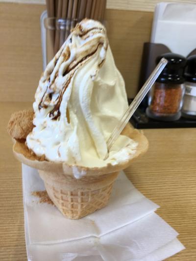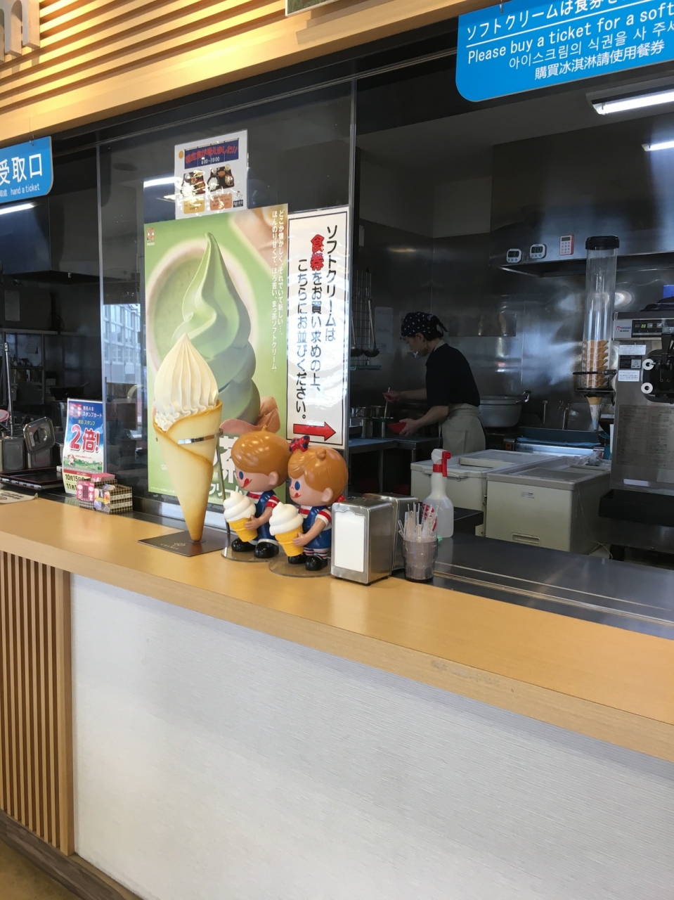 口コミで徒歩で行ってみました。高速パーキングですが、お店(ヤマザキショップ)が接している市道から入れます。最近、このようなパーキング増えてますね。さて、港北食堂にソフトクリーム🍦があります。山梨じゃないけど、ここしか食べられない「信玄餅ソフトクリーム」です。クレミアをベースに黒蜜、きな粉、信玄餅4ケです。いいコラボでした。抹茶、クレミアもありました。