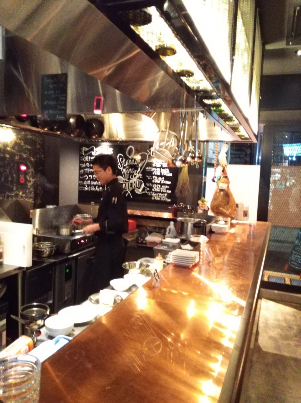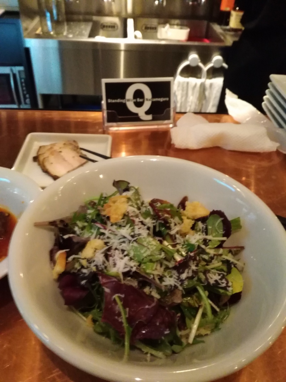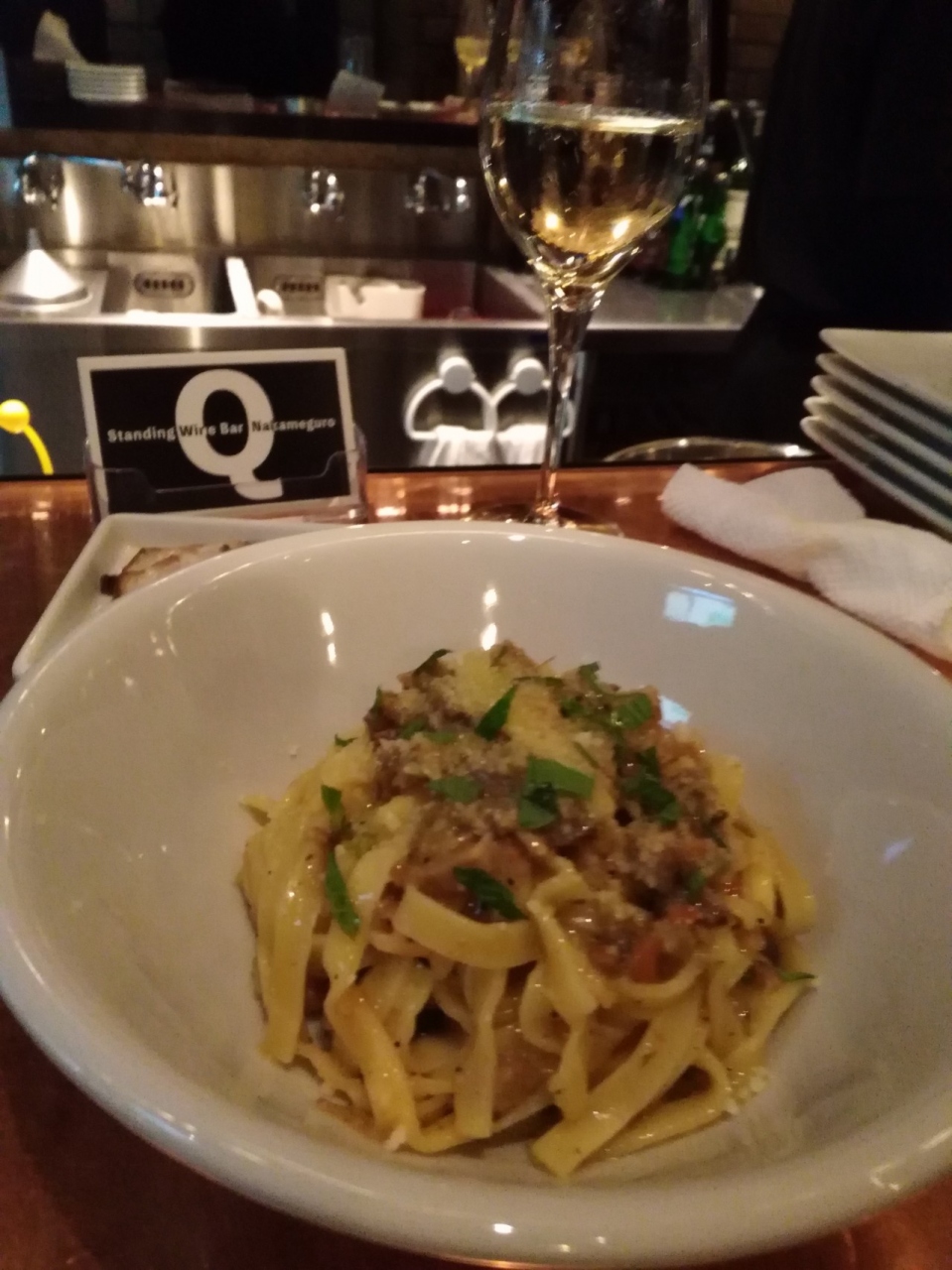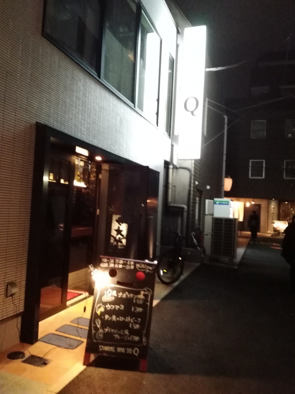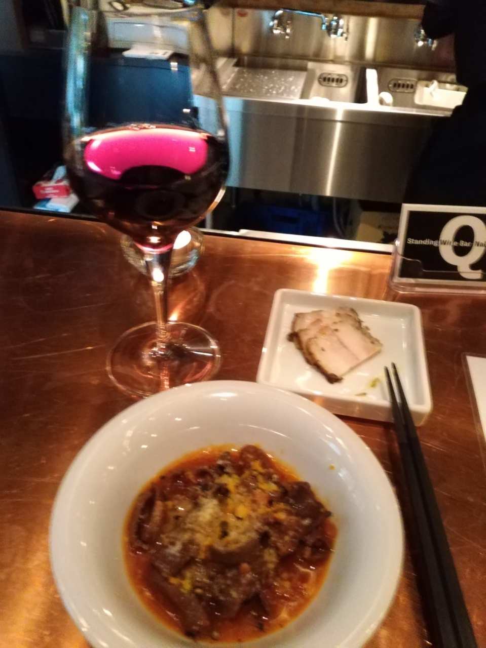 2018年1月オープンした立ち飲みです。恵比寿本店の分かれ。Q風煮込み、アヒージョ(バケット2枚付)、シンプルサラダ、今日のおすすめパスタと発泡、赤ワインをグラス各1オーダー。シェフひとりだけど手際よく対応してくれました。それぞれとても美味しい。特にシンプルサラダお薦めです。Q風ナポリタンは恵比寿本店では定番とのこと。次回オーダーしてみよっと。まだ知る人ぞ知るらしく人気になること請け合いですね。独りで過ごしていたので店員さん、忙しいなかいろいろお話してくれた。とても好印象です。