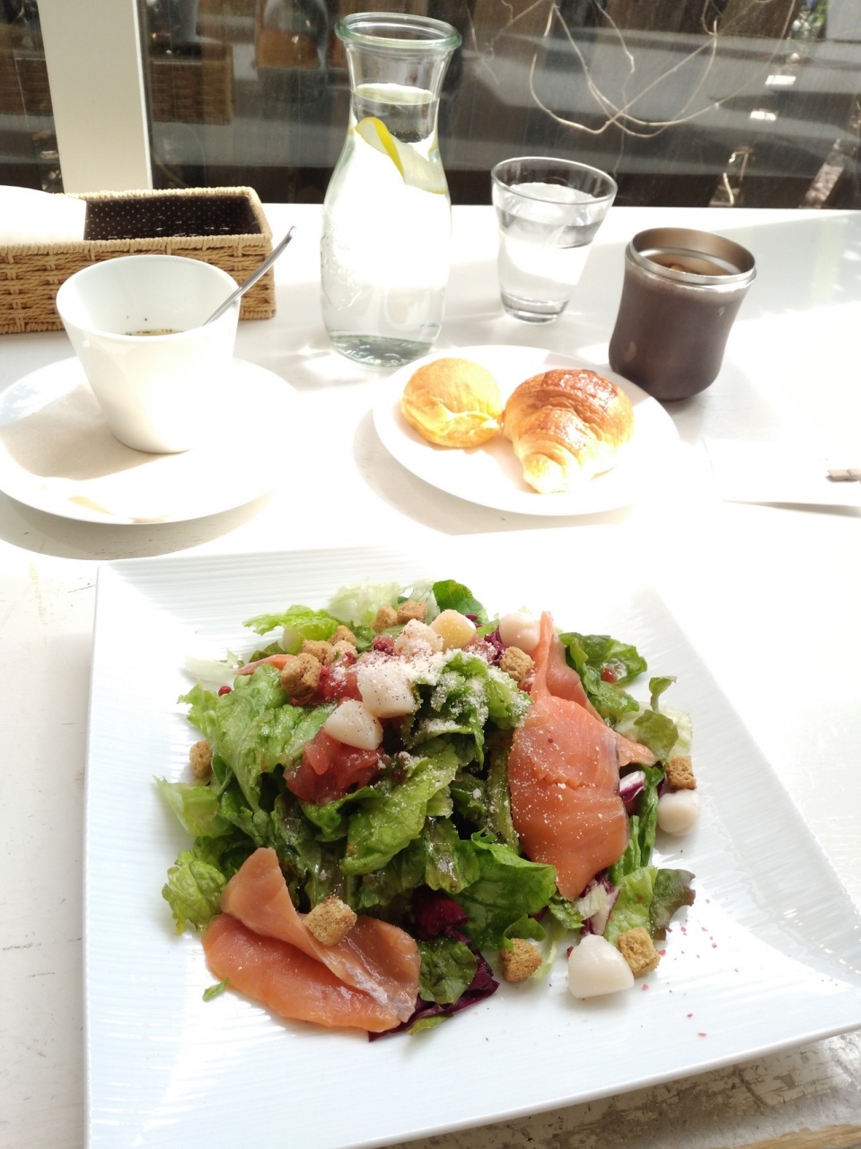 最近クリミアというアイスクリーム、とっても美味しいですが、サラダランチ(スモークサーモンとホタテのオイルサラダ) にしてみました。美味しいパンが食べ放題です。サーモンのサラダもとっても美味しいです(味付けが好み)。デザートにプチソフト🍨が付いてますよ。くつろげて1,020円は安いです。