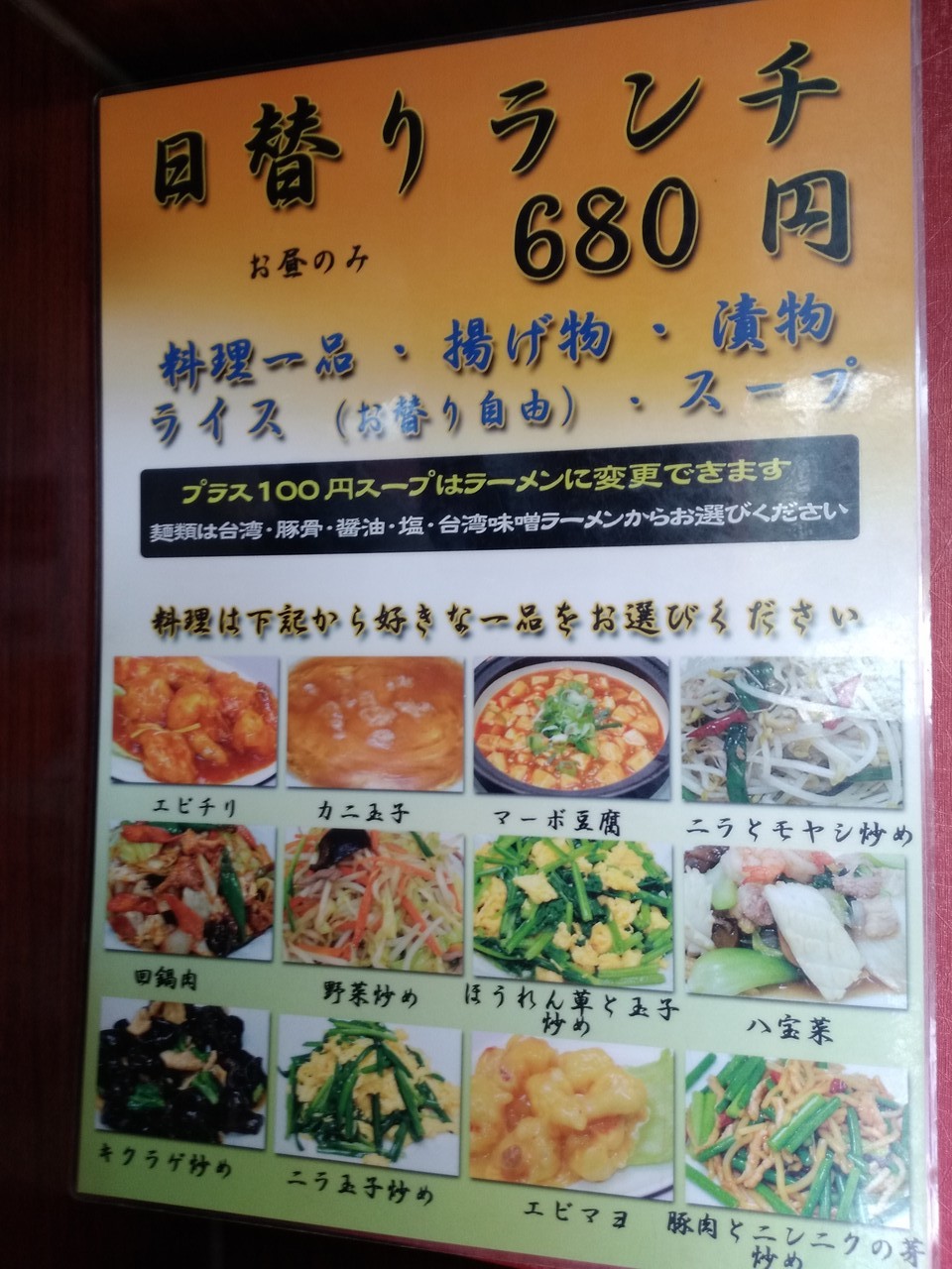 土日でもランチ選択可能です。きくらげ炒めと塩ラーメンセットで食べきれないくらいのボリュームです。数年前に夜行きましたが変わりなく美味しいです。北金目店はドリンク付きで680円だった記憶ありますが、この伊勢原店はドリンクなしでラーメン追加で100円加算の780円でした。店によって多少メニューも違います。確認して下さいね。味は北金目店と同じって感じです。台湾ラーメンがやはり好きです。
