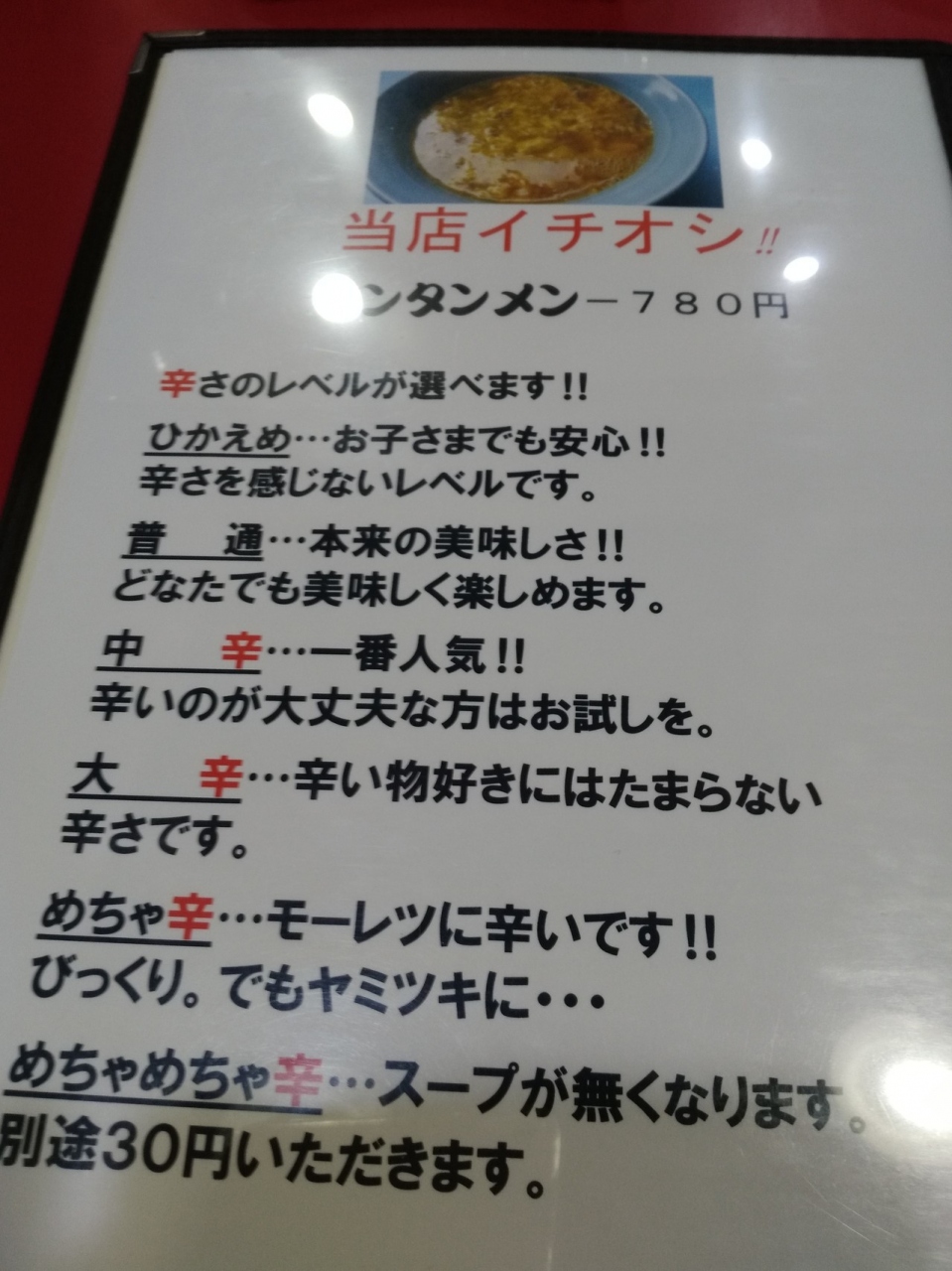 チェーン店だが、味がお店で違うらしいとの口コミで行ってみました。卵が強いタンタンでした。麺は、平麺でした。辛さを選択できます。初めてなので(普通)に、味は卵のせいか?辛さが薄く淋しい味。七味が見つけられずラー油を入れたが改善されず、次回は辛さをアップさせよう!すみません、武蔵小杉でなく程近い新丸子店でした。小杉店は、別にあるそうです→中原区役所のそばらしい。