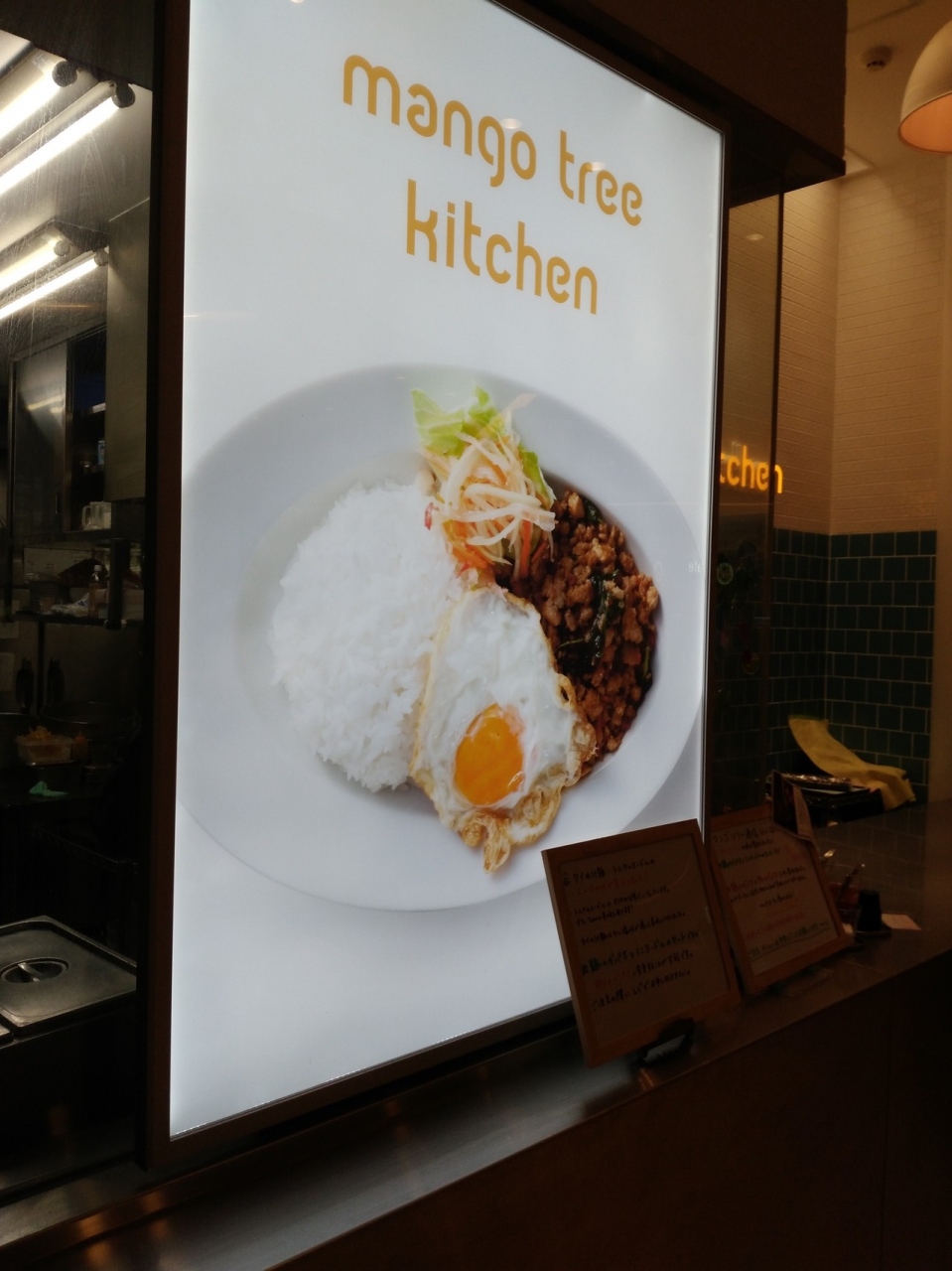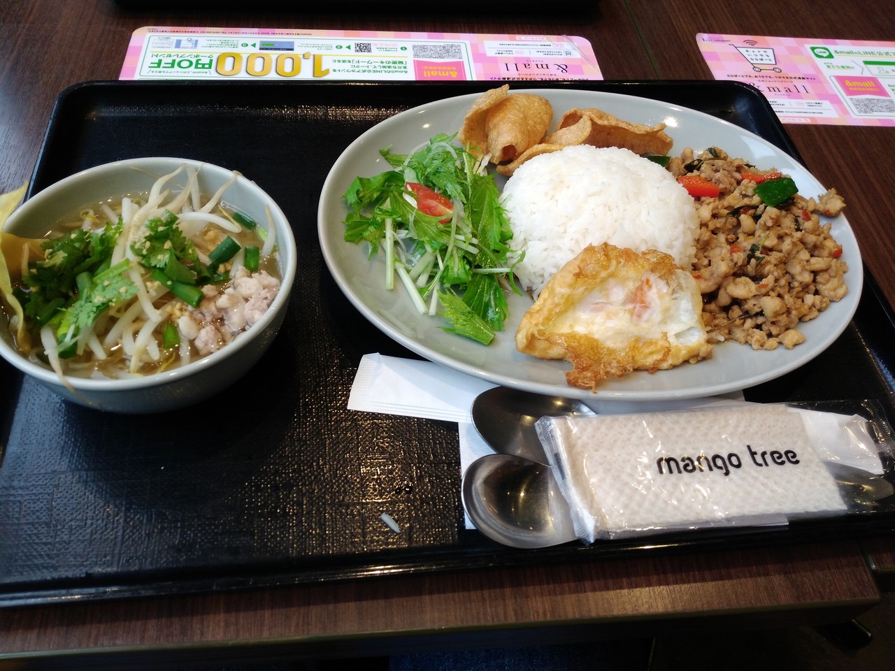 ガバオとたい汁麺のセットにしました(1280円)。普通に目玉焼きが載って、ちょっとサラダがついてます。特製の味付け鶏そぼろとタイ米のライスをほどよく混ぜて食べるとうまい!段々辛さがやってきてイイです。お子さんにはお薦めできません。大人のメニュですね。汁麺は、フォーの感じ。パクチーが載っていて、これも気に入りました。
