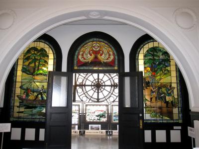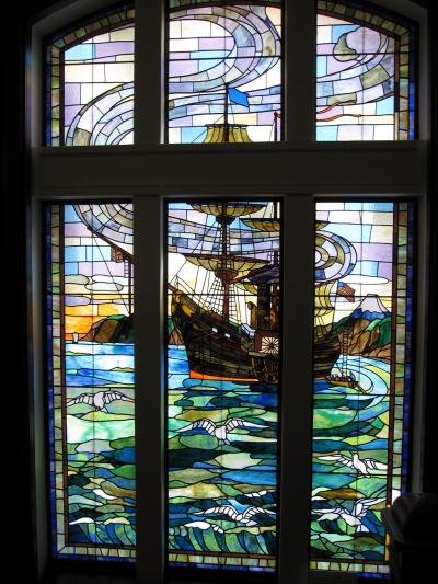 開港記念館のステンドグラスは、開港当時の交通手段の図柄になっています。